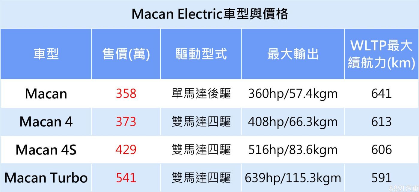 此次登場的入門單馬達後驅Macan,以及採雙馬達四驅設定的Macan 4S,正式售價分別為358、429萬元,加上首波公開的Macan 4與Macan Turbo,目前Macan Electric共有4種車型選項。