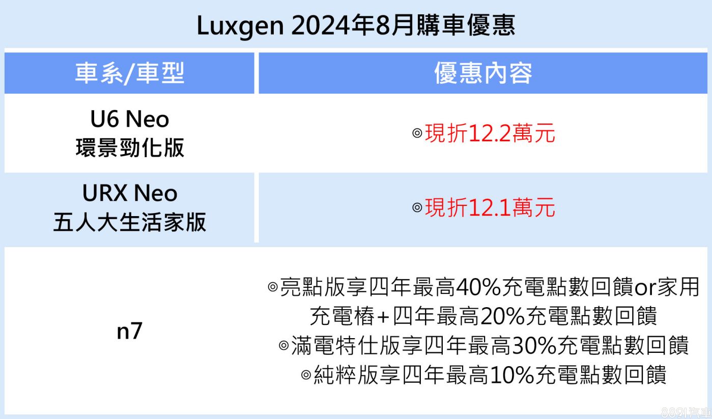 品牌旗下燃油車方面,8月持續推出最實際的現金優惠,購買URX或U6車系指定車型,搭配政府舊換新專案,最高可享17萬回饋。至於n7全車系,也可享充電回饋。