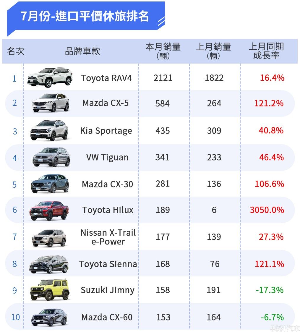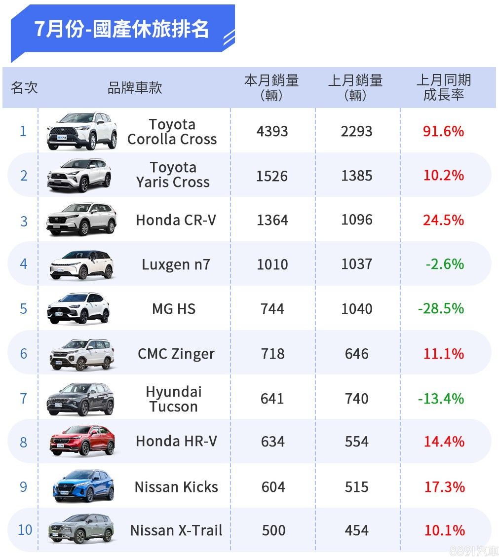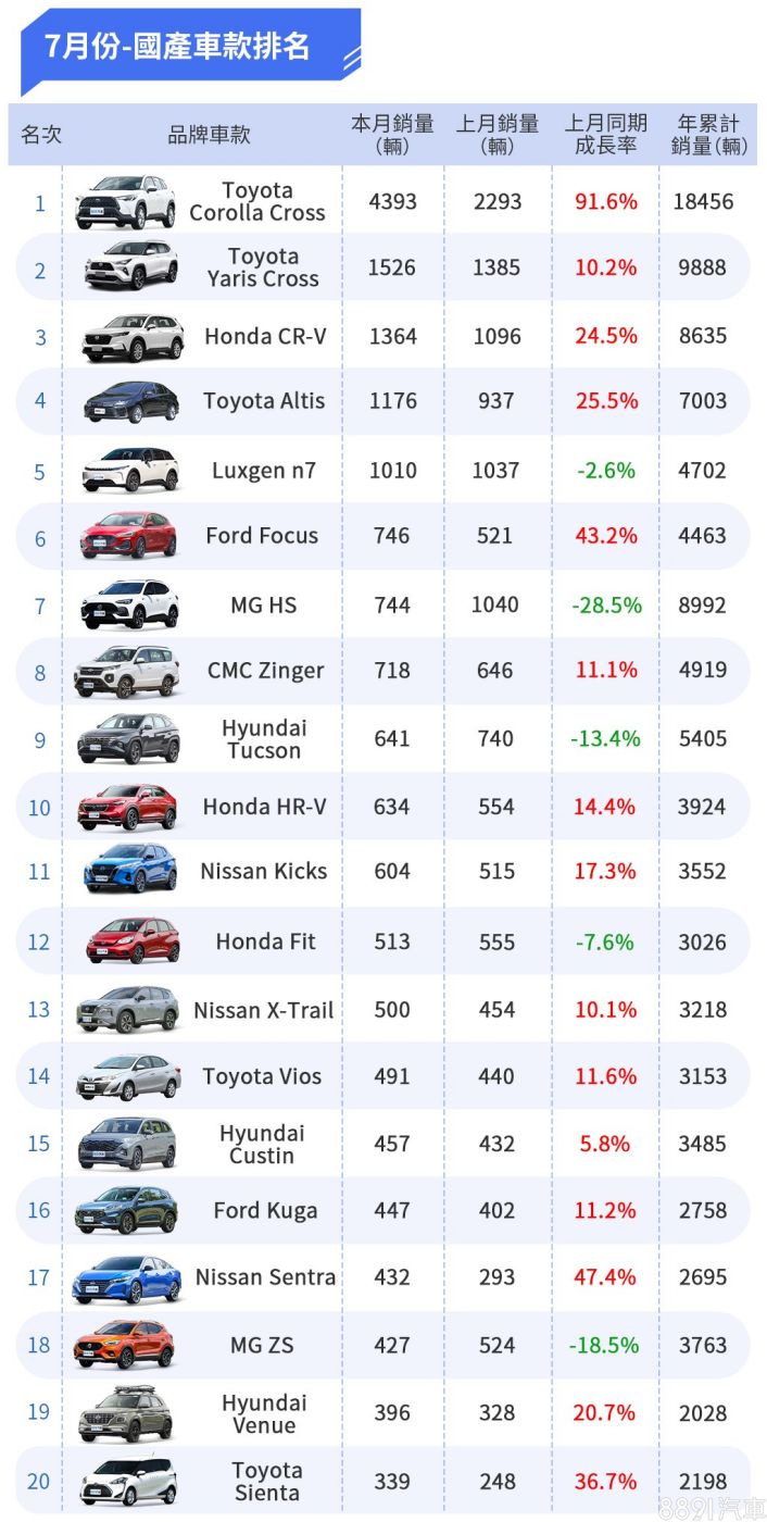 國產休旅前三名排名維持不變,但實際銷售數字相比6月卻是大幅成長,其中Corolla Cross以4393台、成長91.6%的驚人表現力壓群雄,一台車就能抵過別品牌五、六台的銷量加總,神車地位不容質疑。第二名Yaris Cross表現也很出色,月銷1526台、成長10.2%,仍是同級距最受消費者喜愛的車款。CR-V則打破近幾個月千台上下的銷售表現,繳出1364台、成長24.5%。