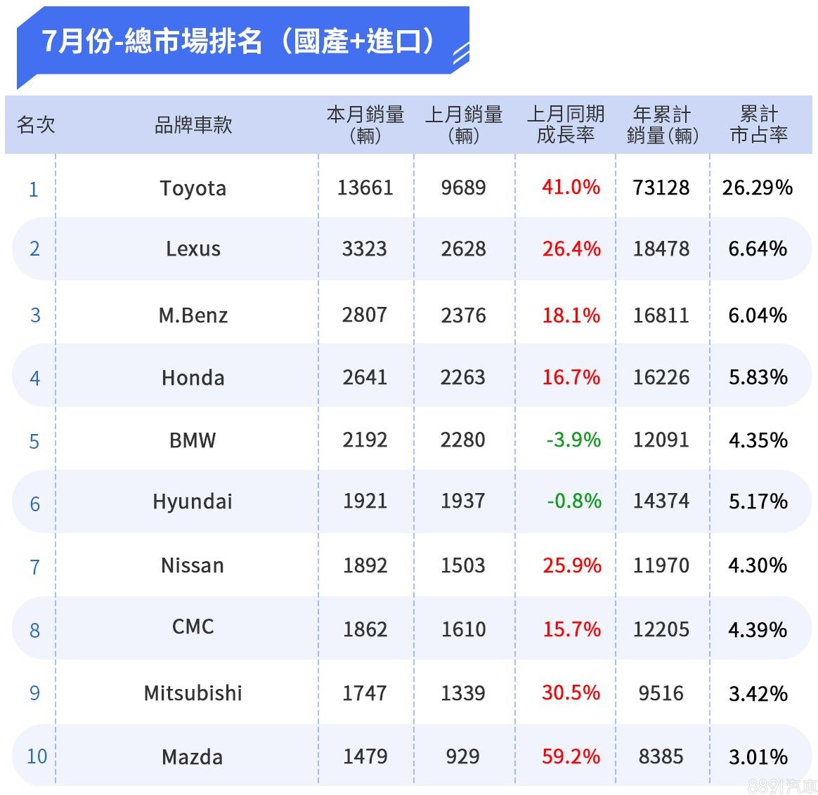 7月雖然受到颱風影響,全台休了至少兩天颱風假,但監理站可領牌工作天仍有21天,各家品牌銷量持續大有斬獲,7月整體登錄台數達到45678台,相較6月成長9.8%,甚至跟去年同期比也有7.8%的成長。可見年中競賽月開跑成效顯著,各品牌加碼讓利大大打中消費者,卯起來買新車!