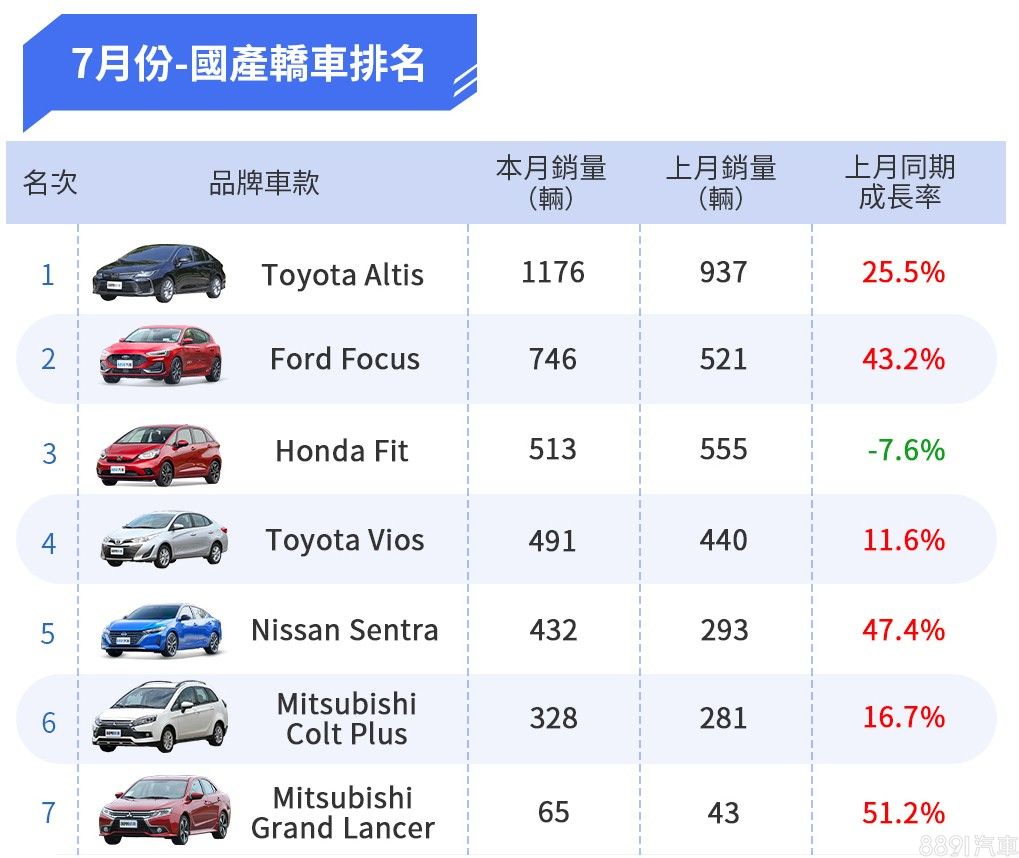 國產轎車同樣呈現普遍成長的趨勢,賣最好當然還是前任神車Altis,掛牌1176輛、成長25.5%,拉開與第二名的差距。第二、三名的競爭則由Focus勝出,以43.2%的成長順利擠下Fit,與此同時Fit也是本月國產轎車唯一面臨衰退的車款。