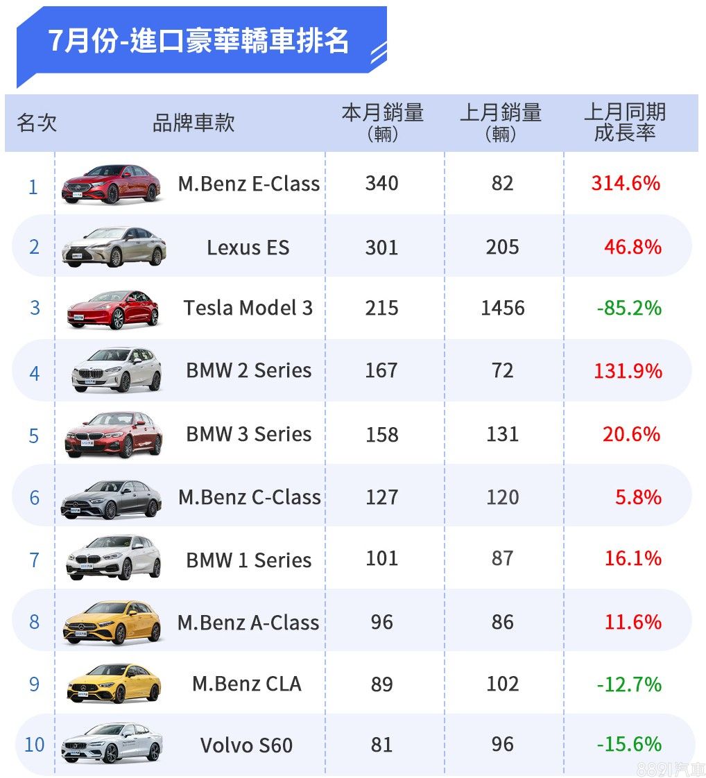 進口豪華轎車本月排名也出現大變動,原因之一是Model 3小改款「煥新版」銷量掉了8成,僅掛牌215輛,但排名還是高居第3位。今年Model 3累積台數2230輛,續佔豪華轎車榜首應該不成問題。