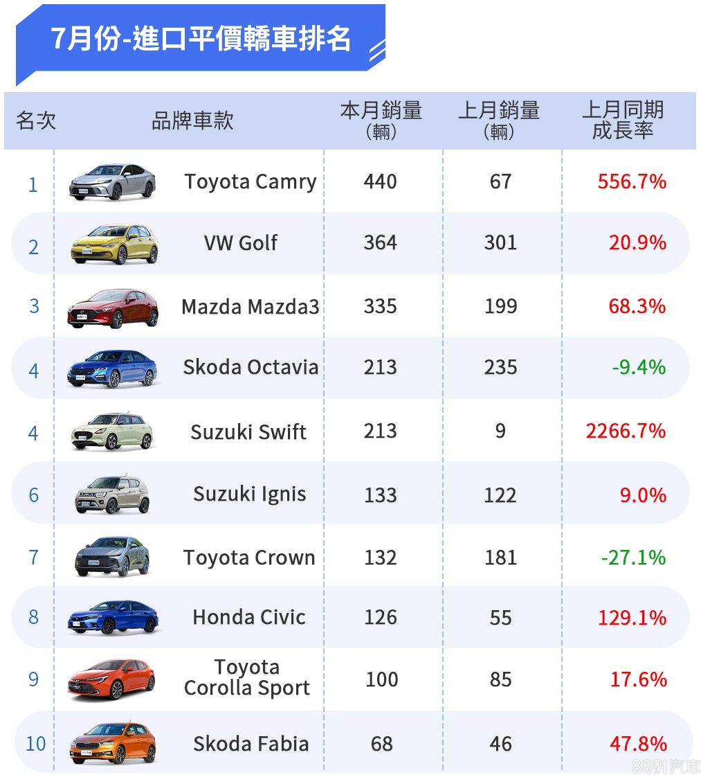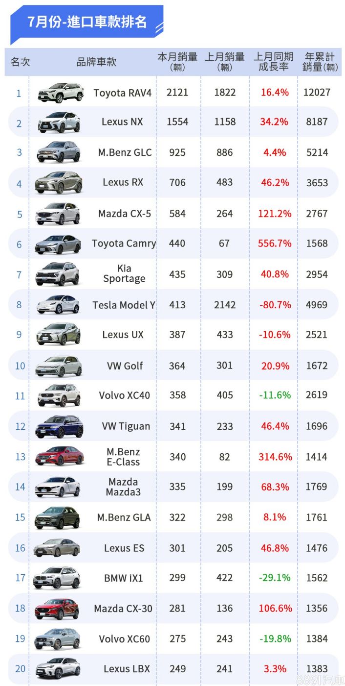 Top 20進口車銷售排名變動不少,這也跟Tesla脫離不了關係,6月繳出破2100台的Model Y,成績跟名次都直接跳水,取而代之的又是「萬年榜首」Toyota RAV4;而榜單中不少車款有「驚人成長」,其中又以大改款Camry的556.7%突出!