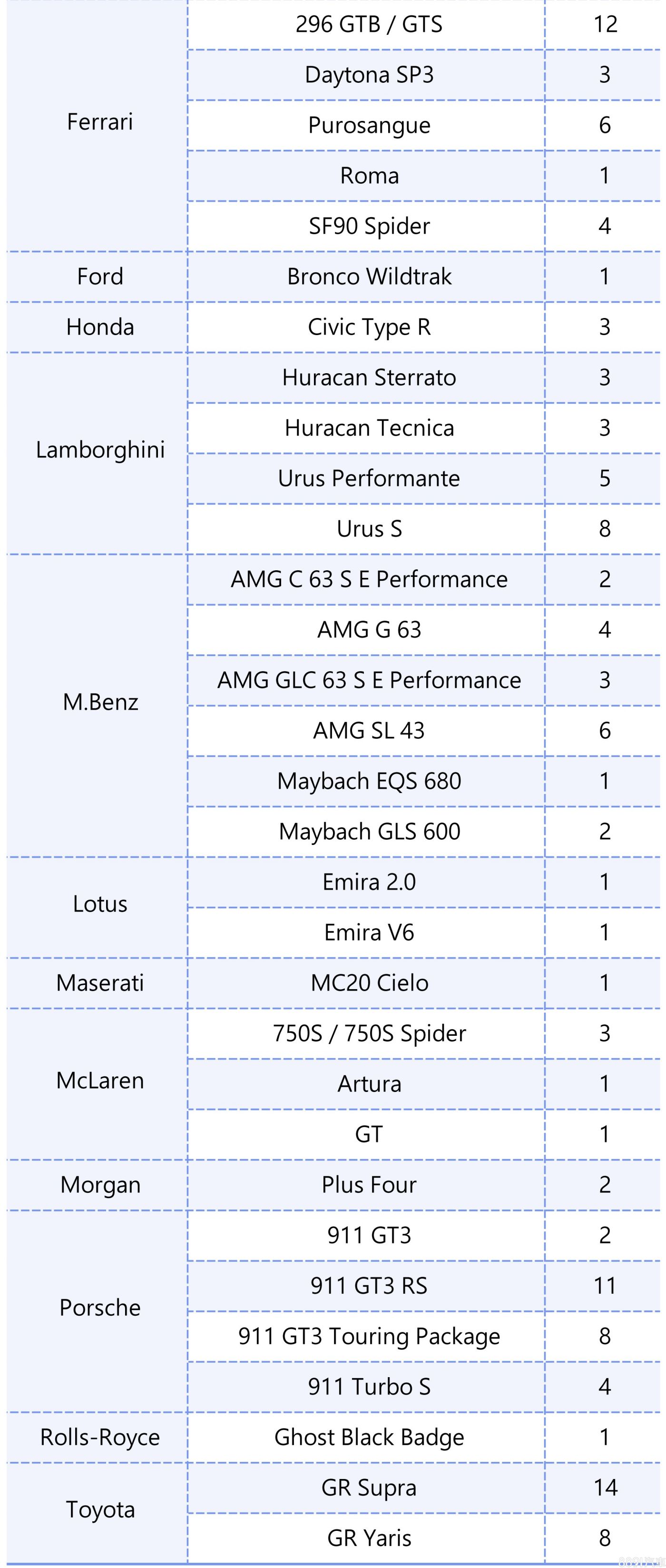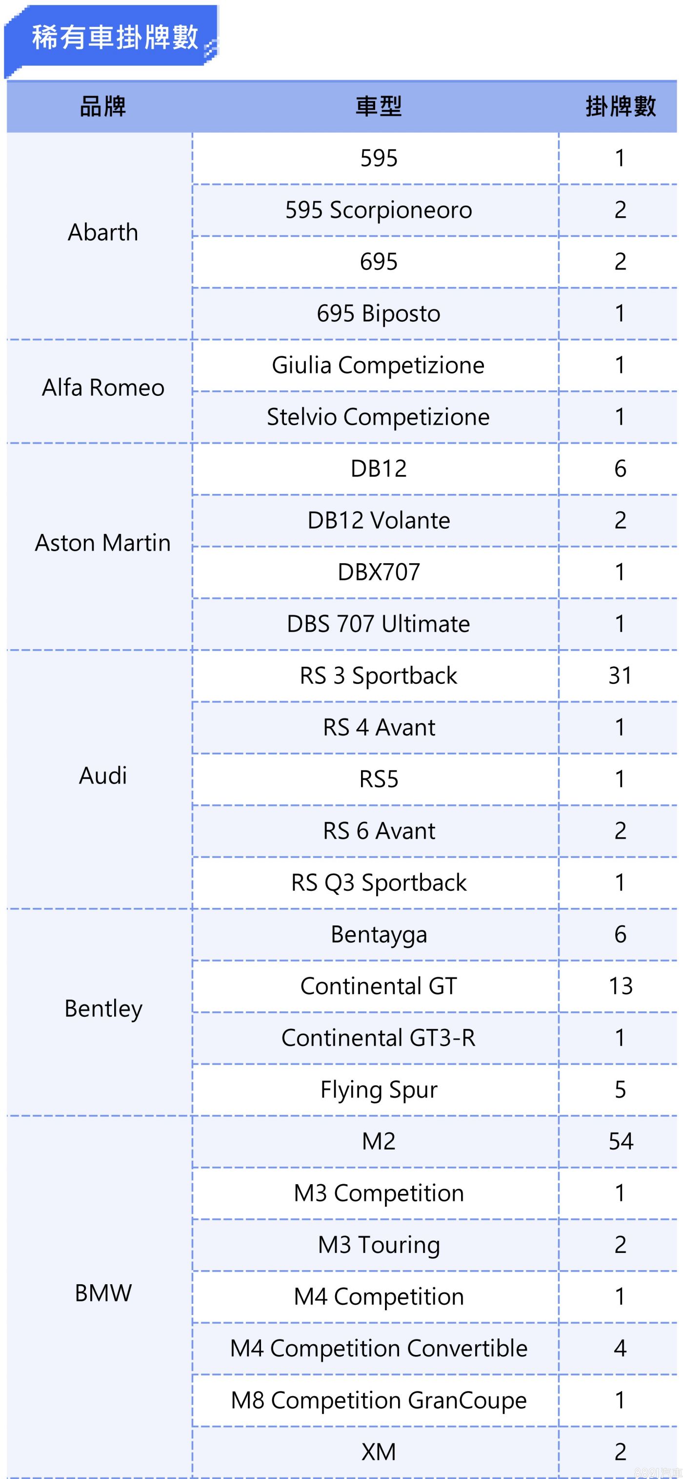 本月稀有車有不少值得一提的猛獸,首先Aston Martin除了DB12「大量交車」,掛牌清單內還有一輛DBS 770 Ultimate,這款全球限量300台的雙門跑車是DBS車系的最終版本,5.2升V12雙渦輪引擎可輸出770hp/91.8kgm,8速手自排也經過賽車部門專屬調校,且車身剛性、懸吊、方向機也都經過再次強化,與此同時,外型也加入嶄新空力設計,並大量採用碳纖維材質,國內報價據傳超過3000萬。