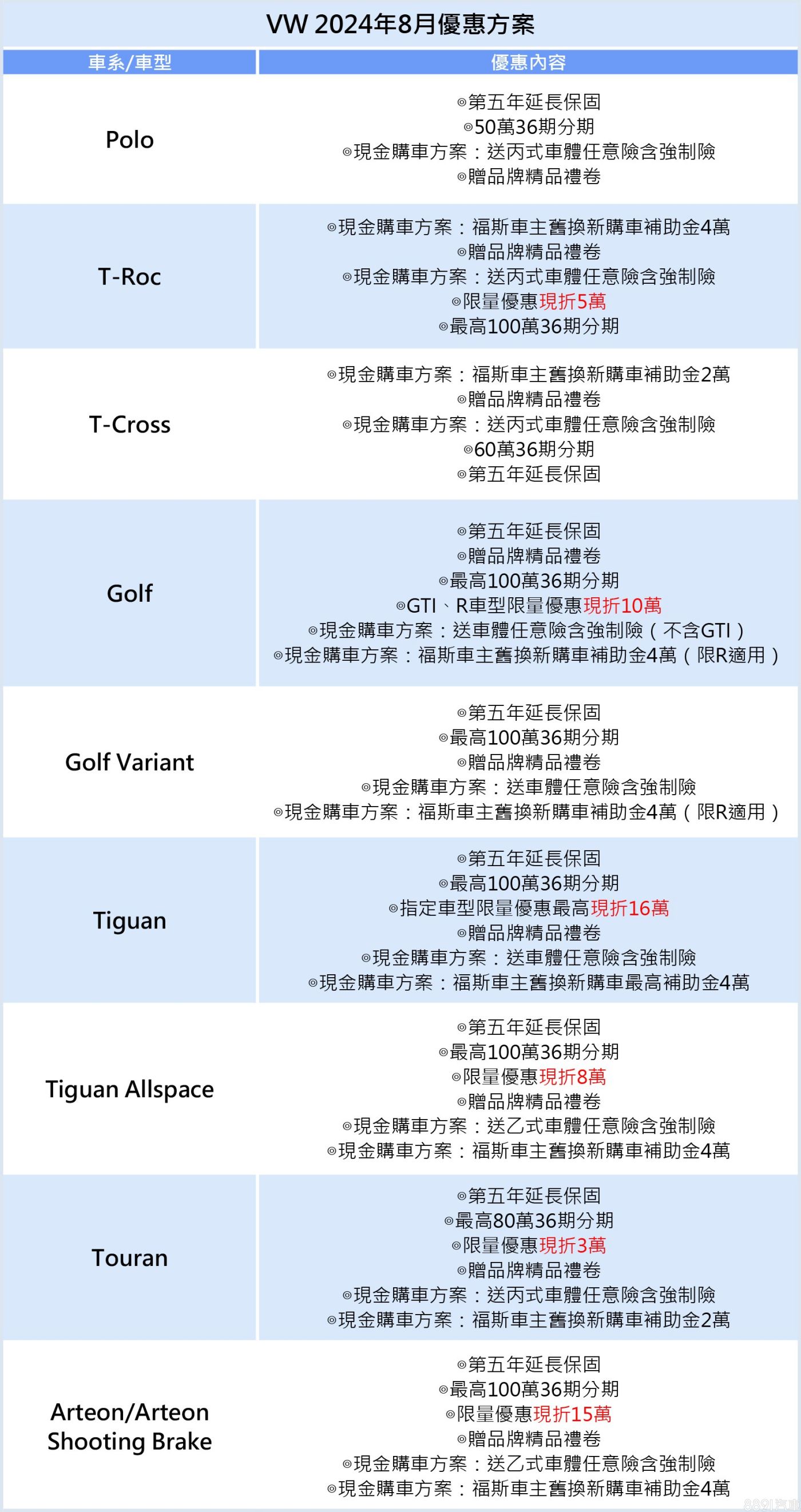配合即將到來的父親節,也追加限定活動,只要於8/31前完成領牌,就能得到價值8800元的品牌精品禮卷;此外,依車型不同,還有車體險、原VW車主補助金、第五年延長保固、高額分期等專案。