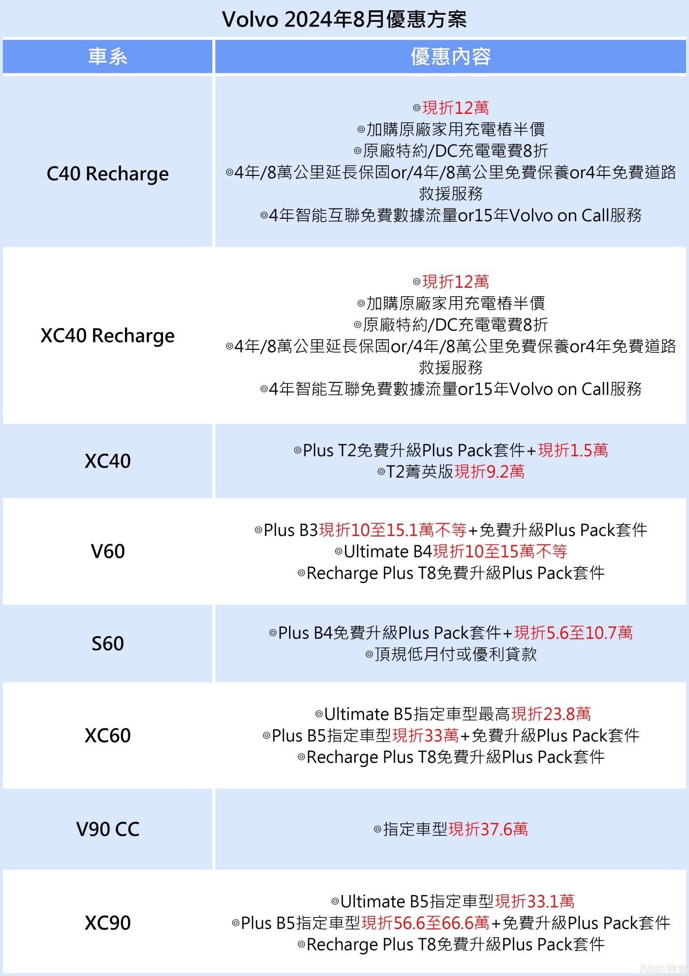 依車型不同,Volvo祭出優惠價格,其中XC90 Plus B5最高現省66.6萬外,還免費升級Plus Pack套件!其餘車系指定車型也有著1.5至33.1萬不等的現金折扣。