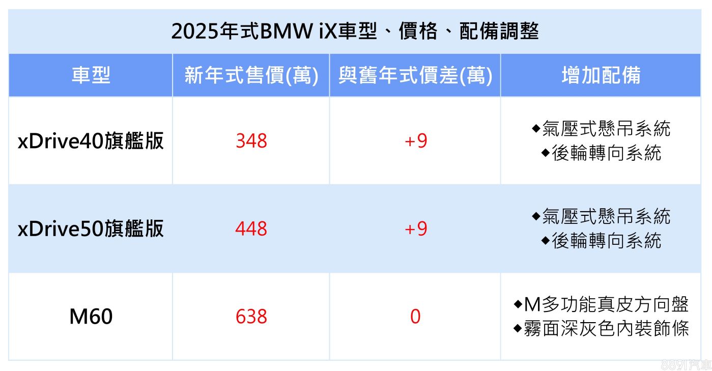 2025年式BMW iX依舊提供xDrive40旗艦版、xDrive50旗艦版及M60共計3車型,開價依序為新台幣348萬、448萬、638萬,售價除了頂規未變外,其餘版本均調漲9萬,不過配備方面也有相對應升級,包含前後軸自動水平氣壓式懸吊與後輪轉向系統均列為標配,可說是相當超值!