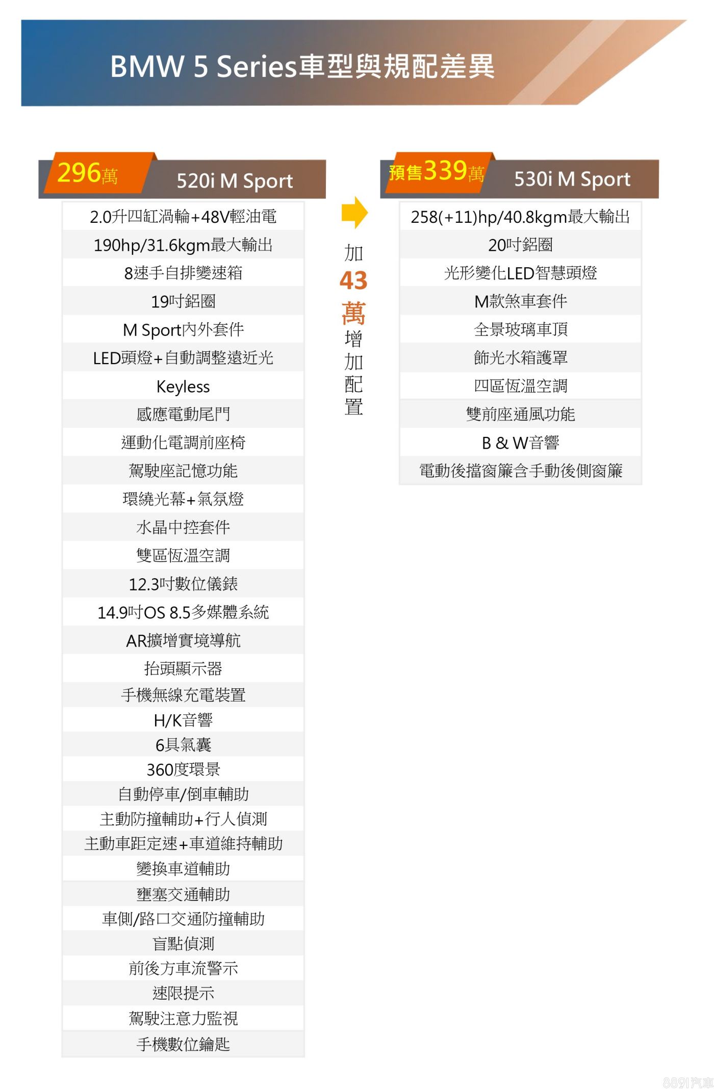 繼520i M Sport後,此次追加的530i M Sport,同樣搭載擁有48V輕油電技術加持的2.0升四缸渦輪引擎,但最大輸出提升為258hp/40.8kgm,輕油電系統則可額外供給11hp出力,目前開出339萬元的預售價格。
