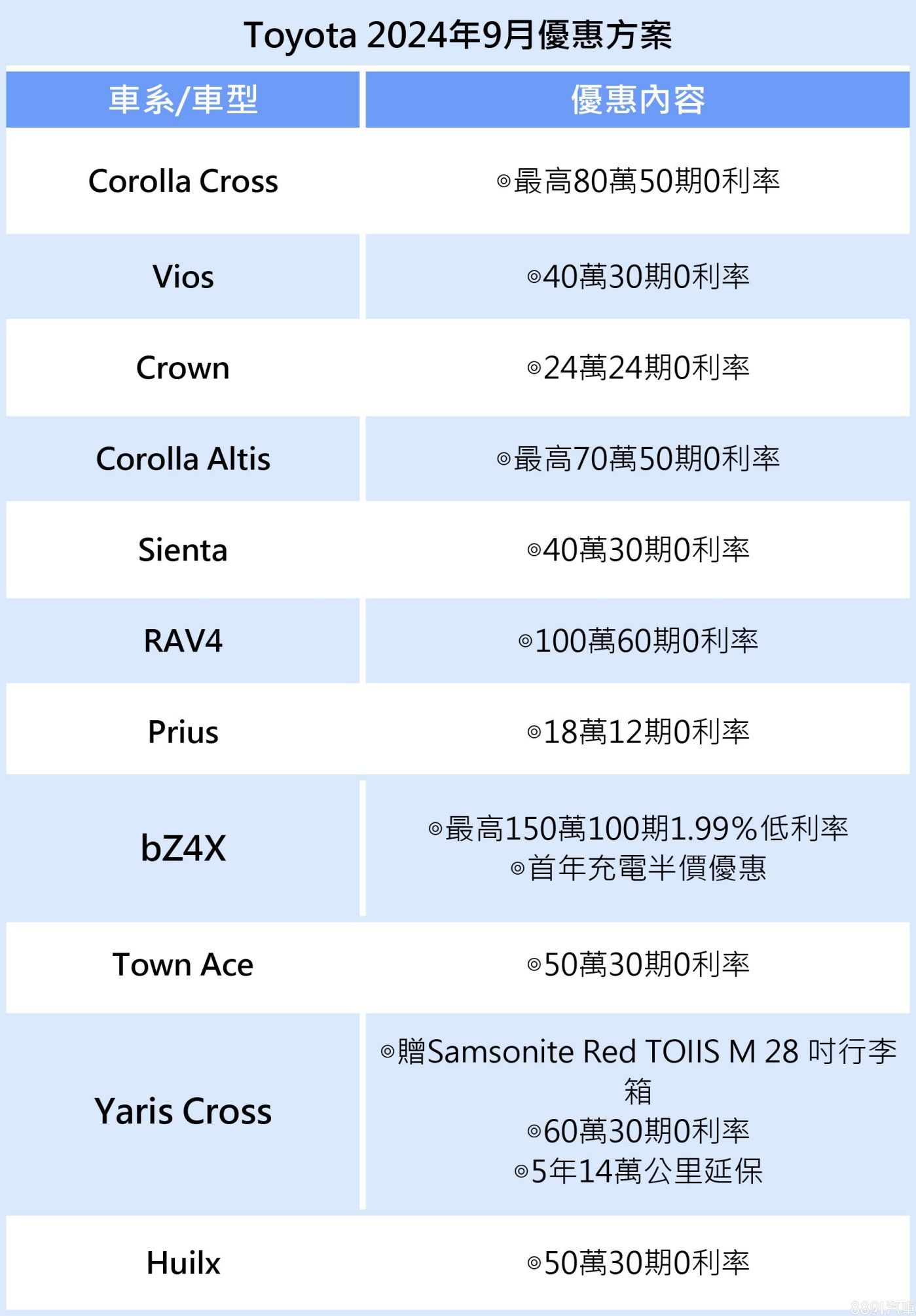 Toyota 9月針對Yaris Cross車系祭出60萬30期0利率,以及5年14萬公里延保購車優惠,並加贈Samsonite Red TOIIS M 28吋行李箱。