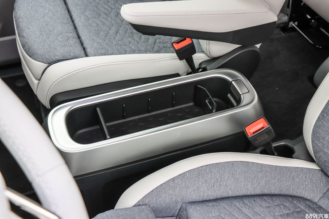 中控台下方設有隱藏式空間,備有2組置杯架,內部還有些許零碎空間可放小東西,需要用時再打開,讓車內看起來更整潔,上方則陳列電動滑門的按鍵。
