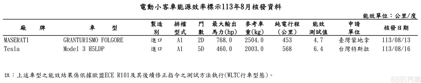 8月僅兩款電動車完成認證,一款為Maserati預告已久的純電雙門跑車GranTurismo Folgore,擁有768hp馬力和453km的WLTC續航表現;另一款則是預計不久後將展開首批交車的小改款Model 3 Performace,其460hp為車系之最,並在WLTC測試標準下繳出568km的最大續航力。