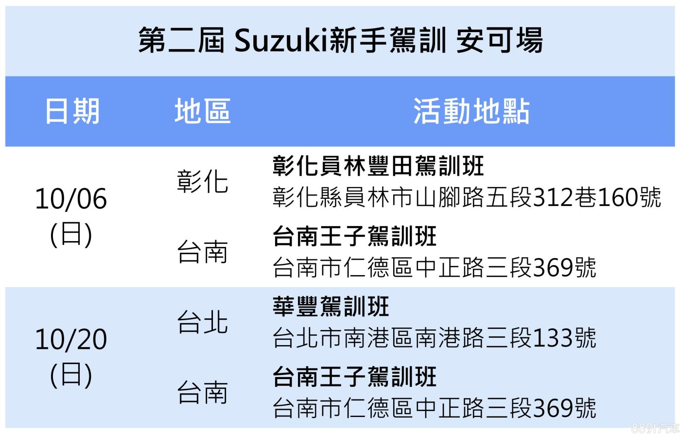 為了讓更多駕駛有體驗新車和精進駕駛技巧的機會,第二屆「Suzuki新手駕訓」宣布將加場舉辦,規劃在10月份於台北、彰化和台南三地追加活動場次,名額有限,開放持有普通小型車駕照的民眾報名,即日起可於官網或向品牌經銷商登記參加。