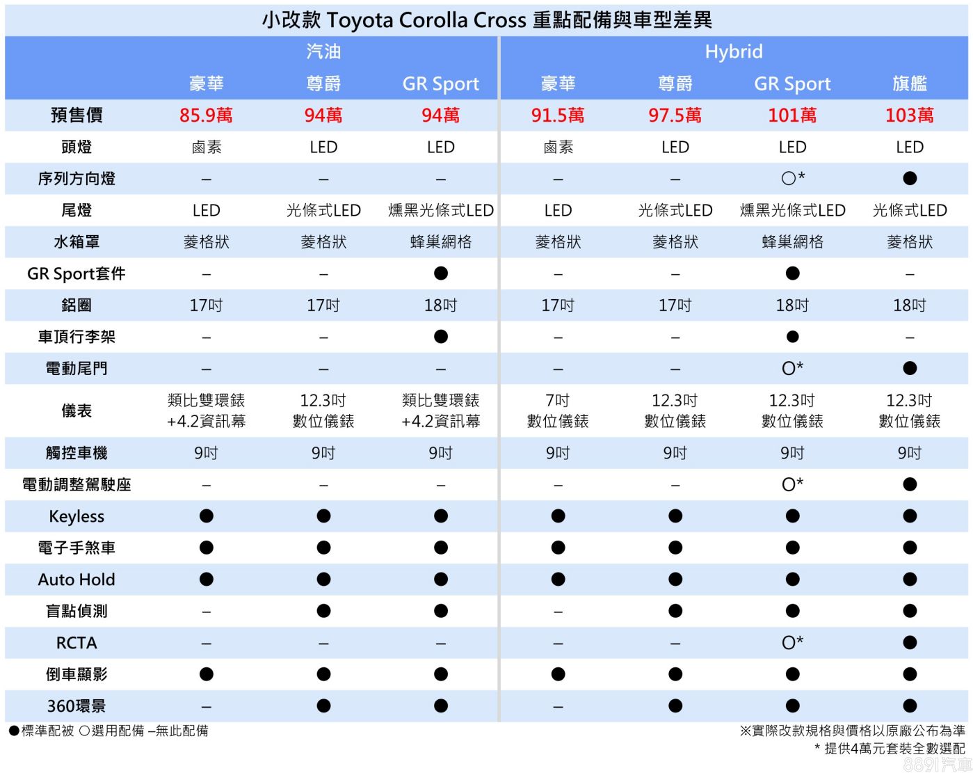 預告10/1在台開賣的小改款Toyota Corolla Cross,將提供「1.8升汽油」和「1.8升油電」兩種動力,全車系隨小改更新導入「電子手煞車+Auto Hold」,取代以往足踏式駐煞車的設計。