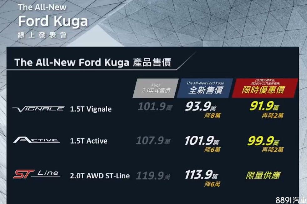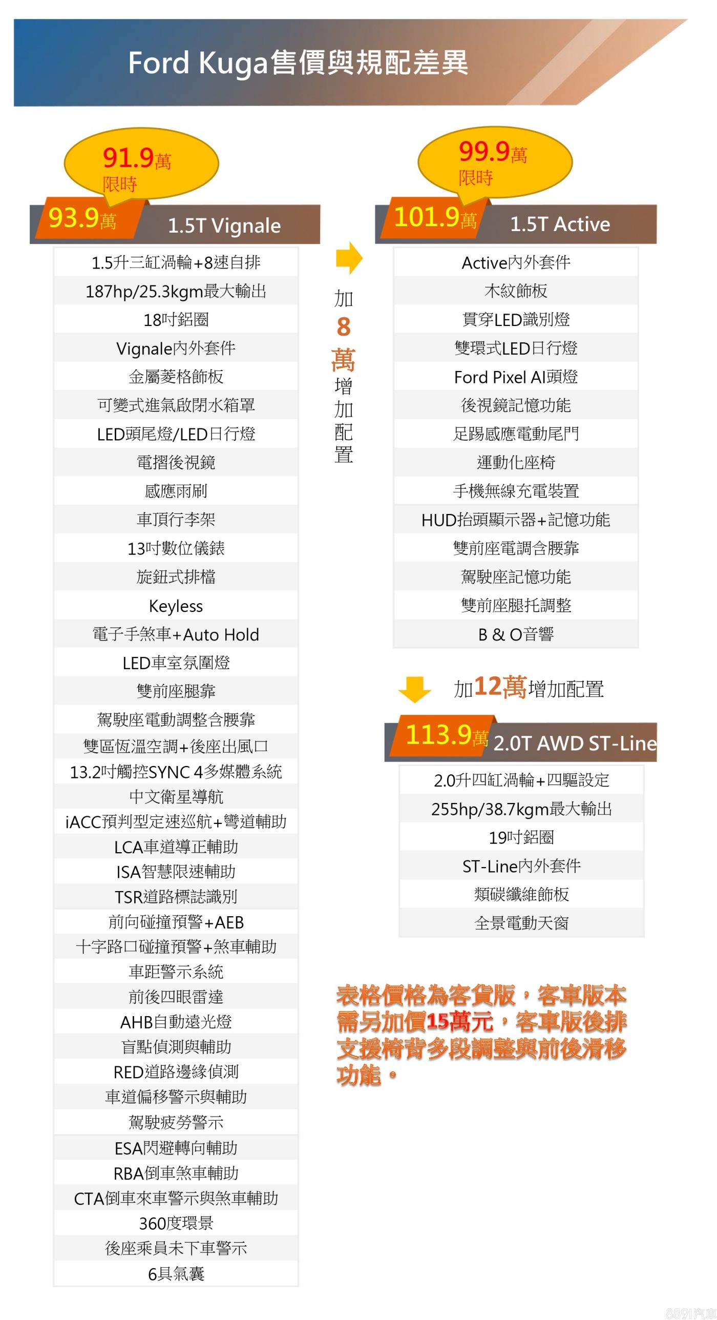 Ford小改款Kuga在台提供雙動力3車型:1.5T Vignale、1.5T Active和2.0T AWD ST-Line,而這次原廠採用客車、客貨並行販售的方式,客貨版3車型售價分別為93.9、101.9和113.9萬元,客車版本則需在既有售價上,再加個15萬元,重點規配如附表。