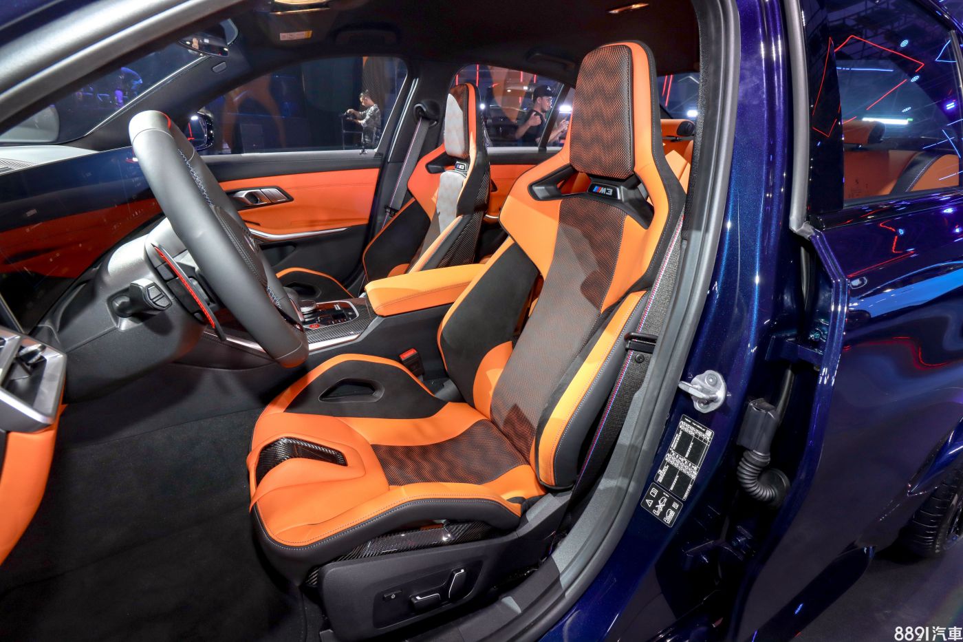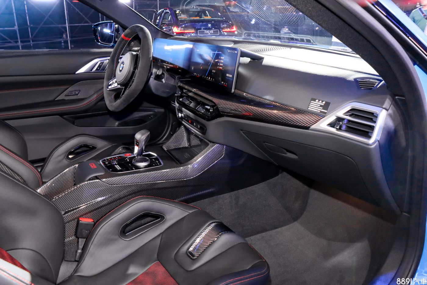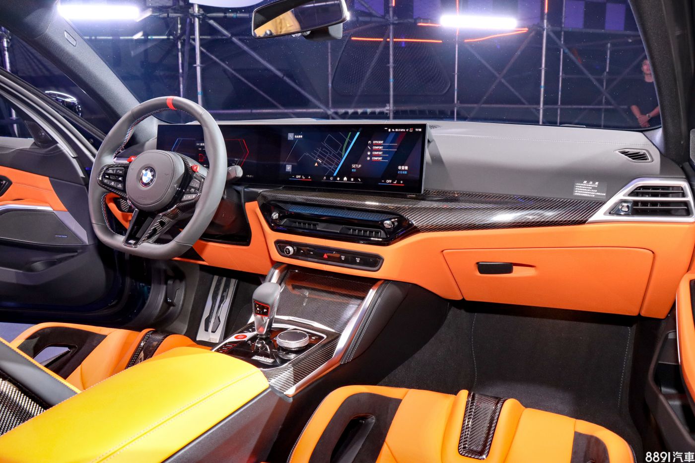 內裝跟小改款一樣,但中控台、方向盤採用大量碳纖維,也標配了碳纖維賽車座椅,連中央扶手都移除了,為的就是輕量化,也讓M4 CS整體比M4 Competition版輕了20kg。
