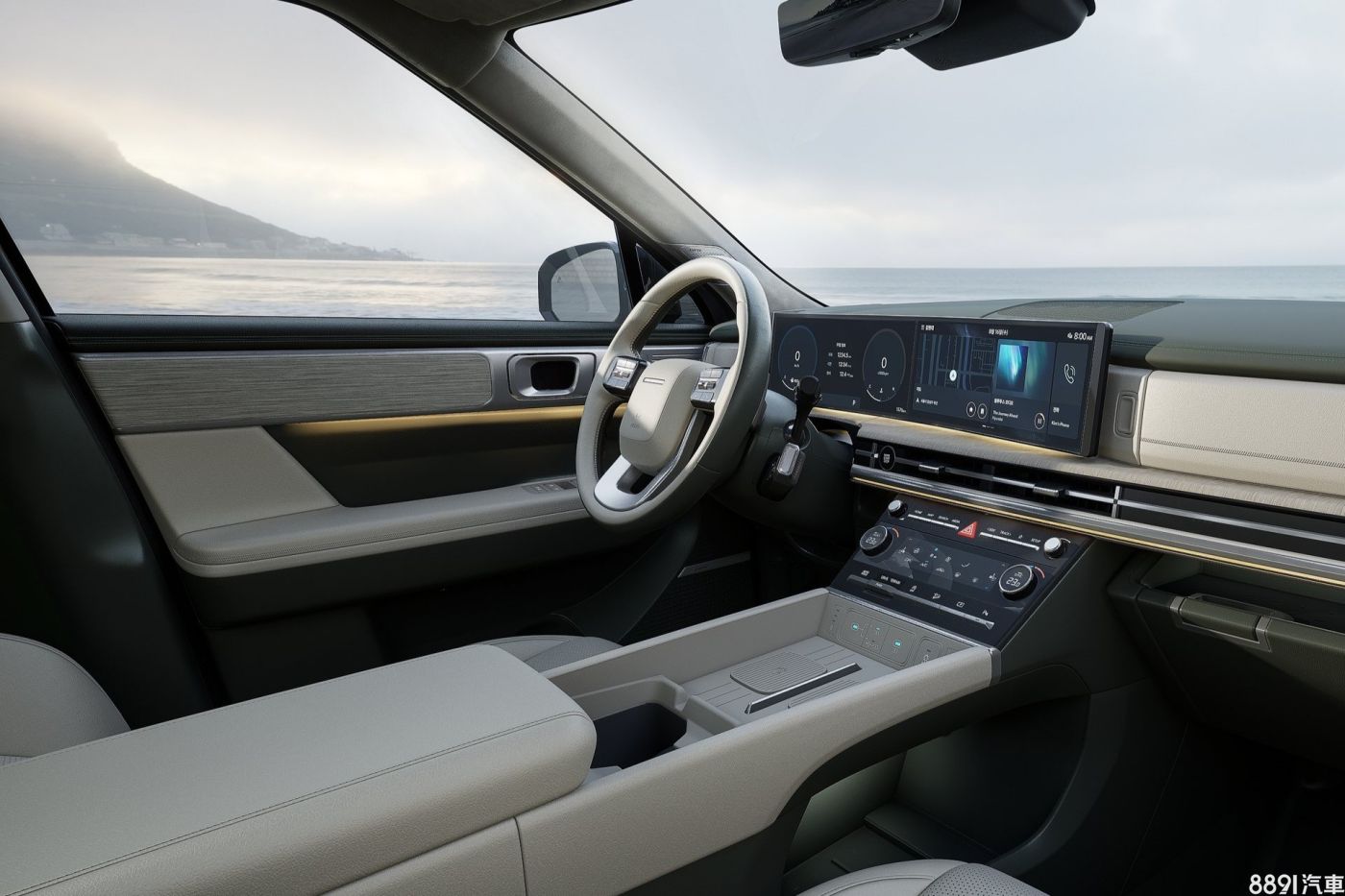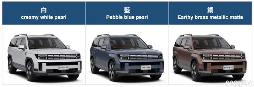 外觀車色方面,全新Santa Fe將提供白、藍、銅三種選擇,內裝色除了入門款GLTH-A是純黑色外,其餘車型皆為黑/白雙色配置。