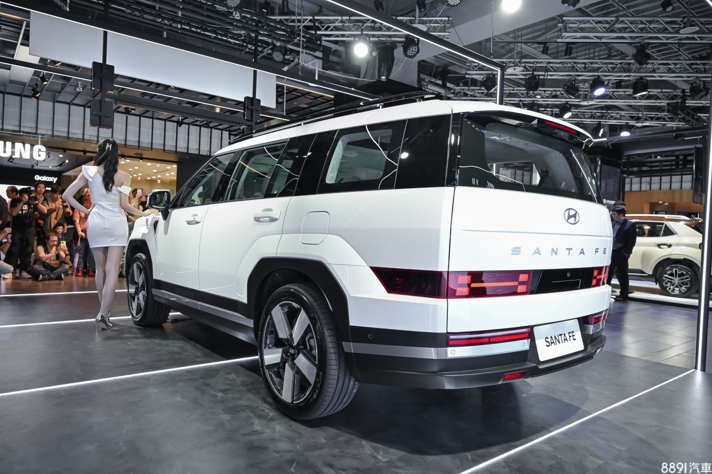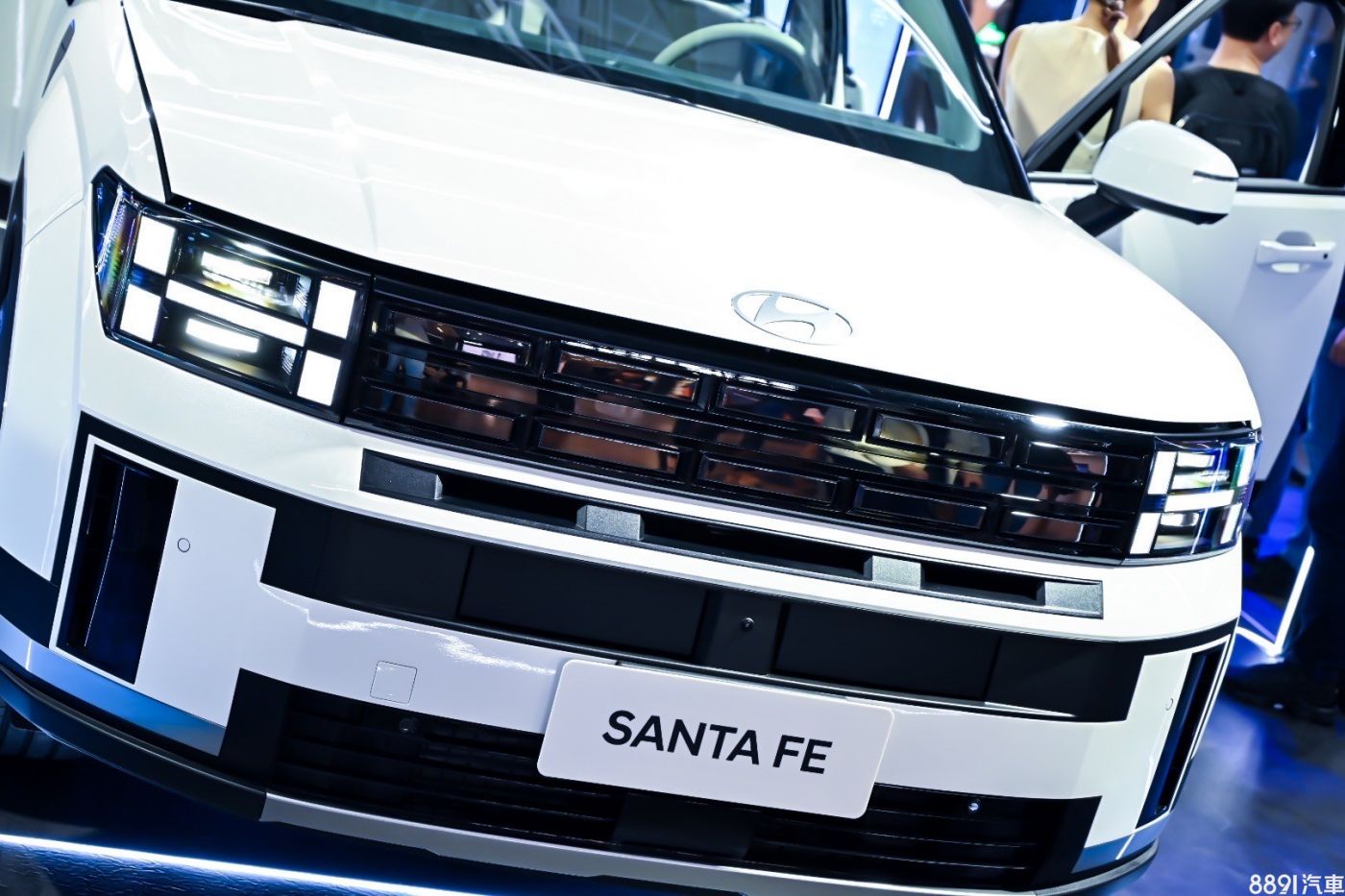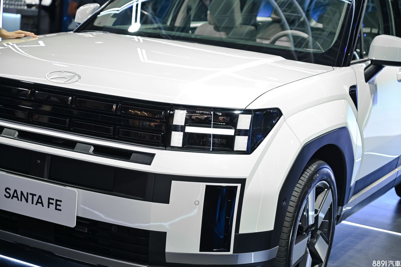 大改款Santa Fe與前代相比,可以用「脫胎換骨」來形容,外觀採用幾何方正元素、簡約筆直的線條,搭配H型為主軸的大面積水箱護罩,讓車輛看起來更加寬闊,給人粗獷的第一印象,外觀車色提供有白、藍、銅三種選擇。