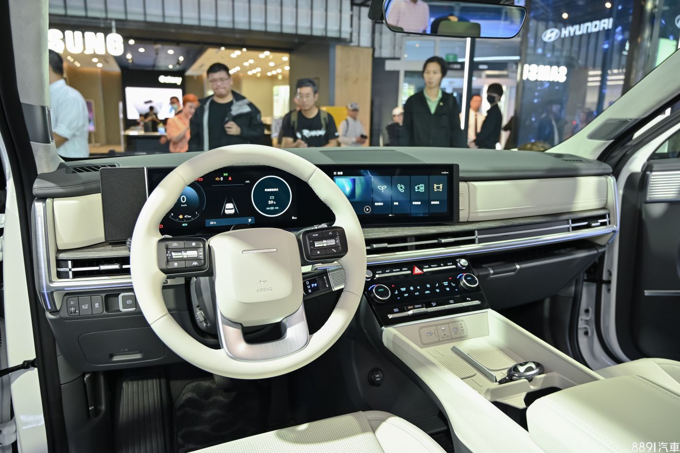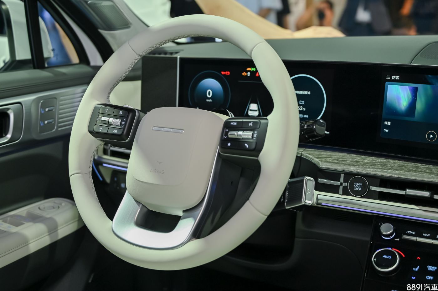 三幅式方向盤造型簡潔,並且也跟進Ioniq 5、Ioniq 6等車款採用無Logo的設計,多功能按鍵左側可執行ACC、LFA,右側則可操作音響、行車資訊等,全車系均附方向盤加熱,GLTH-C車型再升級方向盤電動調整功能。
