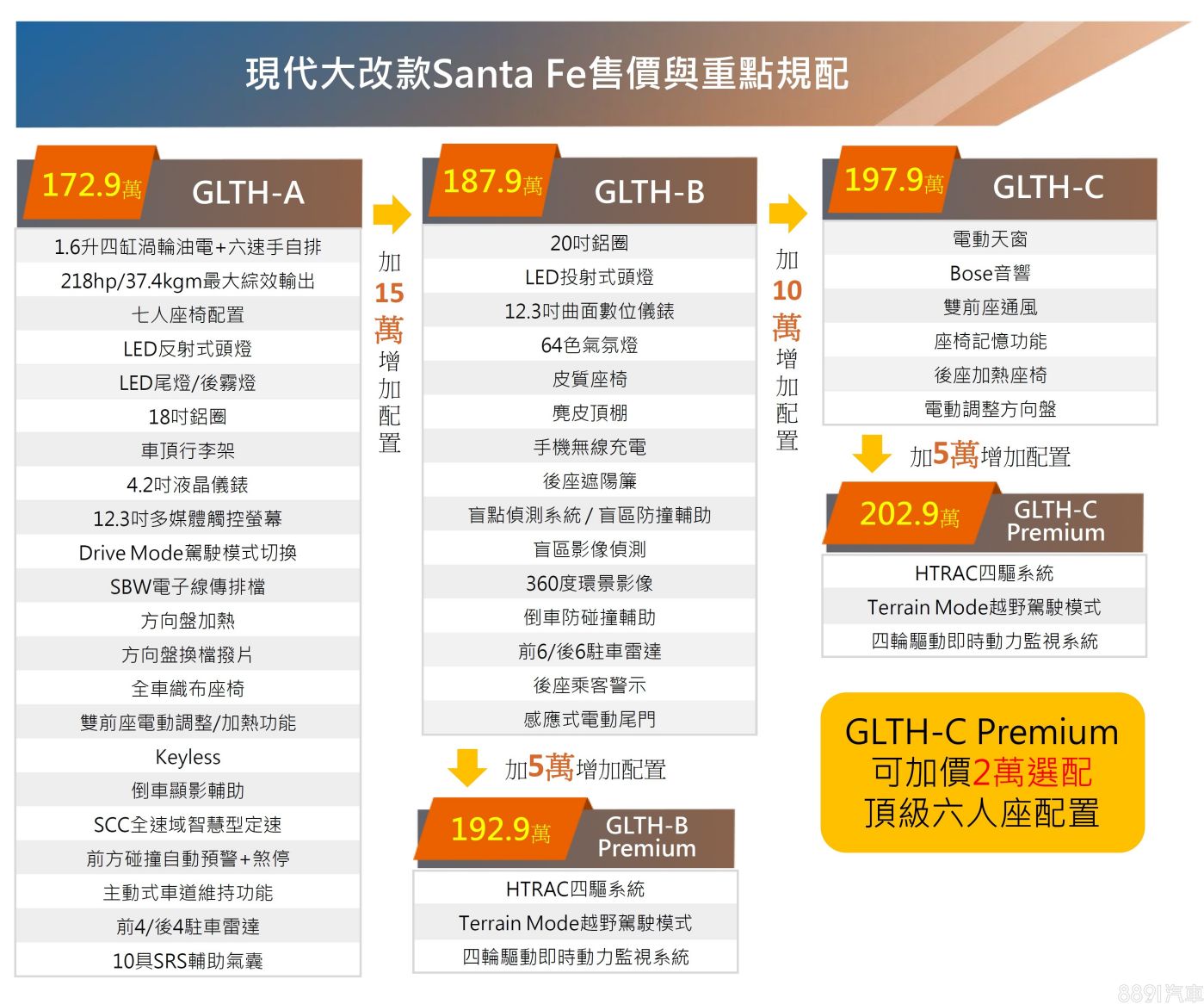 新一代Hyundai Santa Fe採單一油電動力、七人座配置,並規劃GLTH-A、GLTH-B、GLTH-B Premium、GLTH-C、GLTH-C Premium共計5款車型,正式售價依序為172.9、187.9、192.9、197.9、202.9萬,其中頂規版另可加價2萬選配六人座,據了解自10/15預售起跑以來已累計超過200張訂單,約8成車主選擇GLTH-C車型!