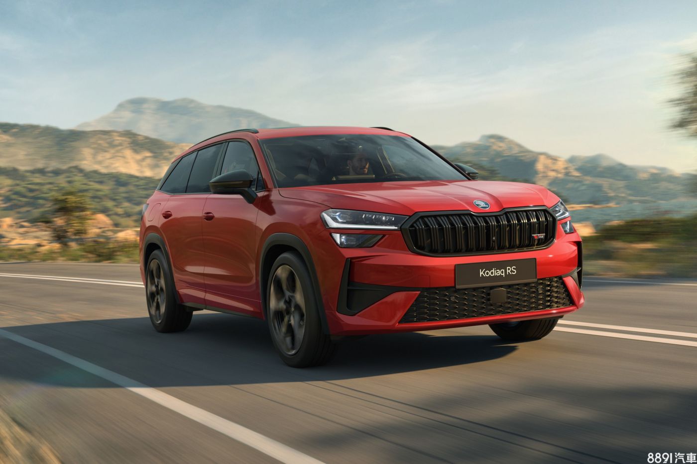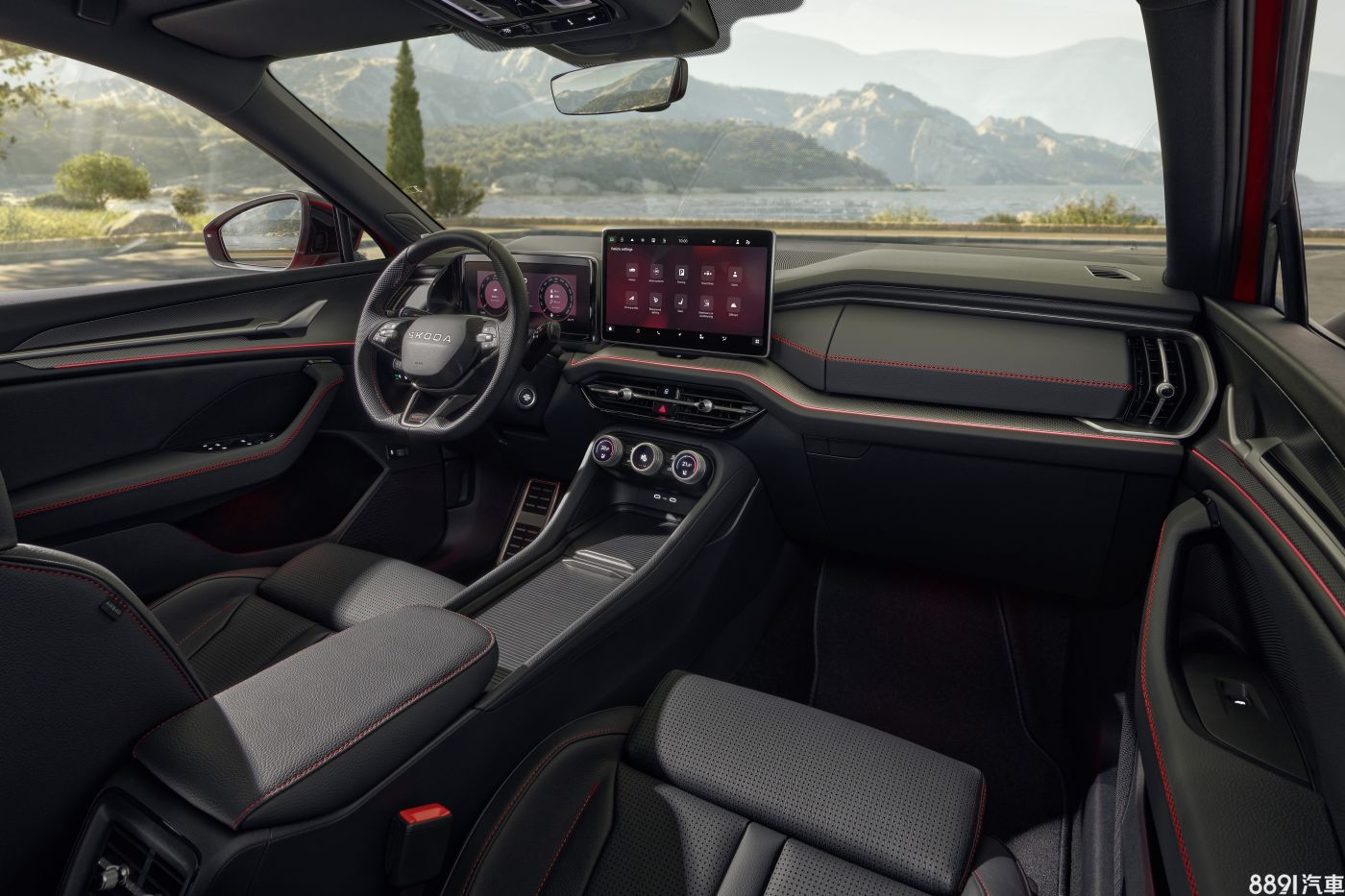 座艙維持新一代Kodiaq既有設定,包含10吋數位儀錶、13吋觸控多媒體螢幕、Smart Dials智慧旋鈕都列為標配,RS版本則是追加RS Logo的三輻式方向盤、不鏽鋼油門/煞車踏板、跑車化座椅、專屬Kodiaq RS字標門檻,並透過大量紅色車縫線、人造麂皮等多樣材質,來營造車內的熱血氛圍。