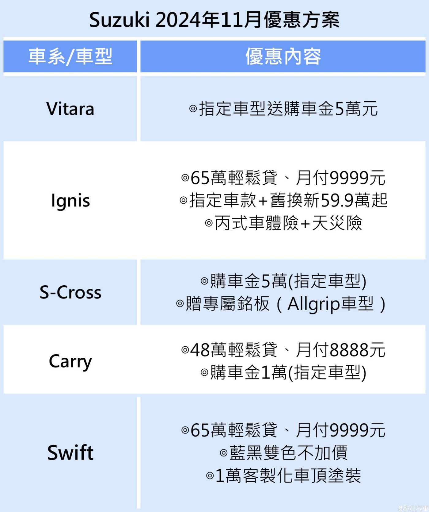 本月入主Ignis,領牌就送丙式車體險,以及天災損失保險;購買Vitara、S-Cross也有購車金回饋,依車款不同,還有輕鬆貸、低月付等專案,欲知更多詳情,可洽官網或各地展示中心。