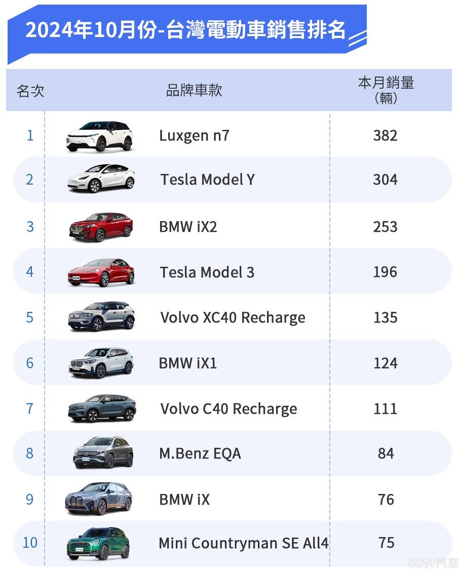 若算入Mini,BMW集團10月共有4款電動車系登錄Top 10排行,是登榜數量最多的車廠,當中iX2更拿下季軍席次,而共享開發平台的iX1和Countryman SE,也稱得上是不算意外的進榜常客。