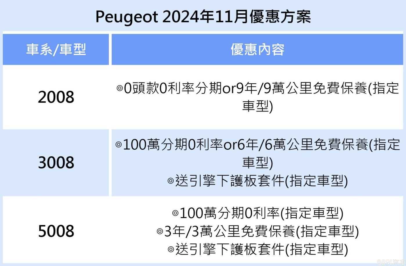 Peugeot指定車型均享高額0利率,以及延保、免費保養等專案,入主5008和3008另可免費升級引擎下護板套件。