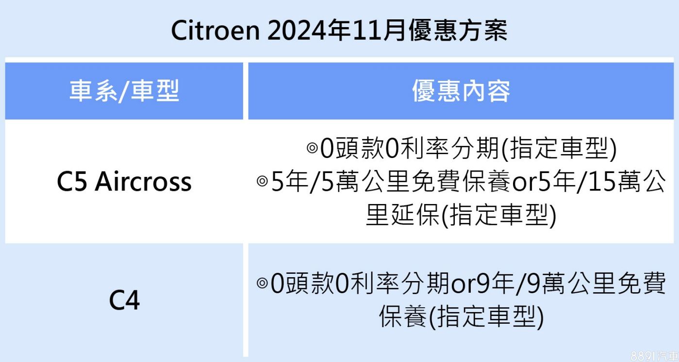 針對C5 Aircross、C4指定車型,除了能享0頭款,也提供最高9年/9萬公里免費保養,更多詳情可洽官網或各地展間查詢。