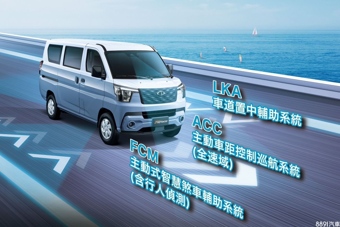 J Space導入了FCM前方碰撞預警、AEB自動緊急煞車輔助、全速域ACC和LKA車道置中維持輔助等安全系統,符合Level 2駕駛輔助標準,不過並非全車系標配,僅限貨車頂規和4款「豪華型」廂車搭載。