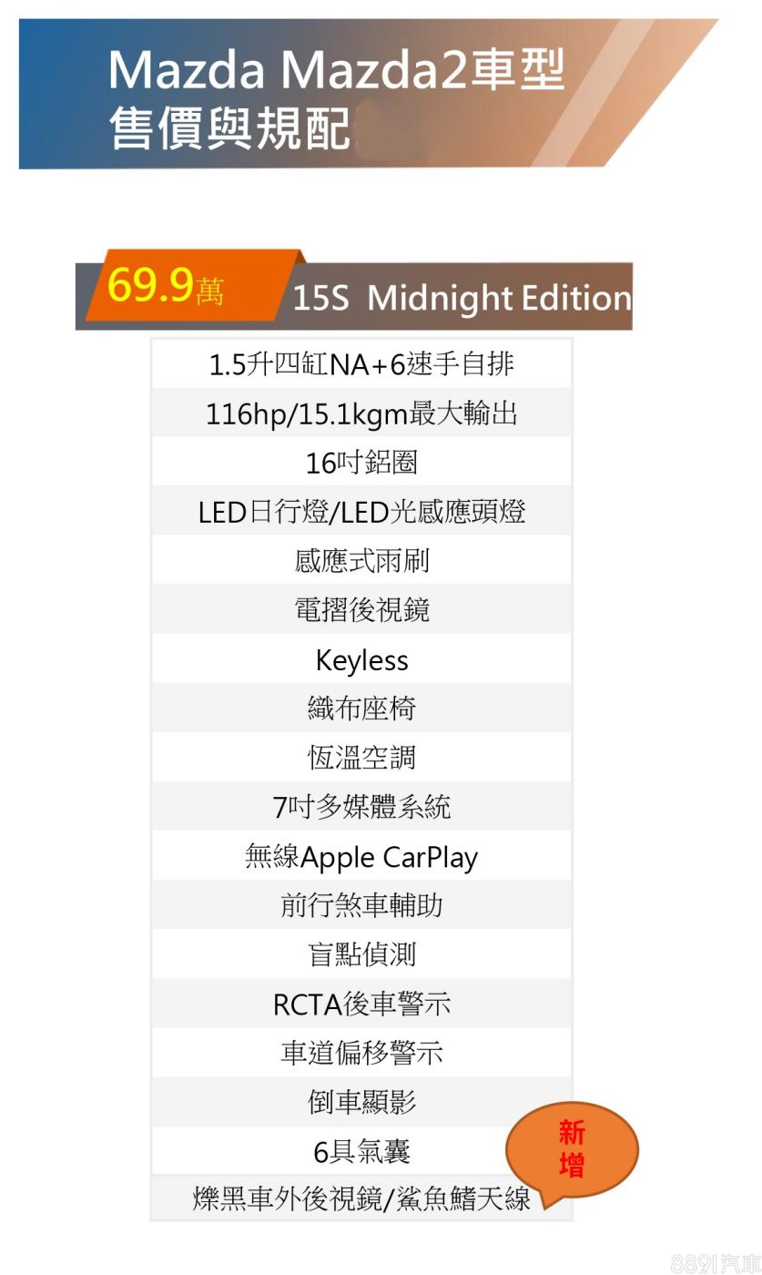 新年式Mazda2提供15S Midnight Edition單一車型,開價69.9萬元,比先前入手價便宜了9萬,配備沒少,還多了爍黑鯊魚鰭天線、爍黑車外後視鏡,雖是微幅升級,但也能對車身外觀起到畫龍點睛之妙。