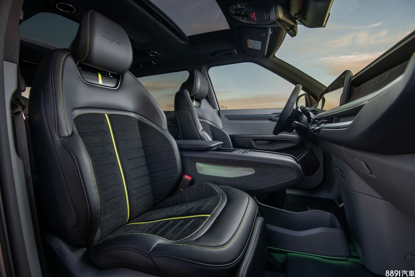 EV9 GT全車座椅均採皮質與人造麂皮混拼包覆,並針對雙前座換上跑車化座椅,除了針對乘坐支撐性做加強,頭枕上還印有「GT」字樣作為車型專屬識別。