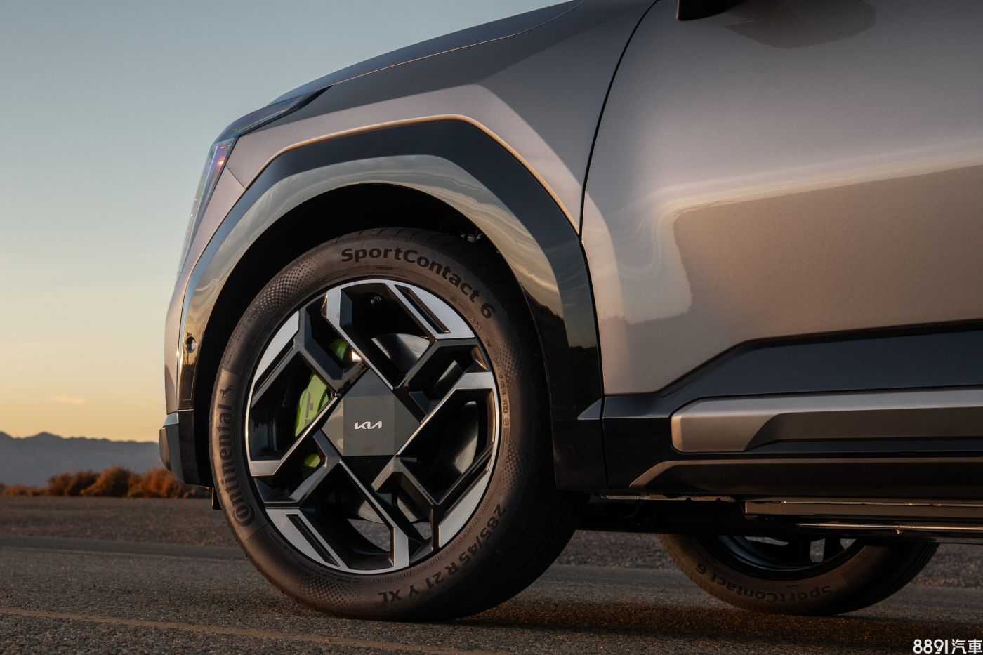 外觀風格上,EV9 GT幾乎沿用了GT-line的造型設計,但車頭新增Active Air Flaps主動啟閉格柵,鑲嵌於車頭護板內的數位光柵,則加入專屬排列圖案,四輪並標配樣式獨特的21吋鋁圈。