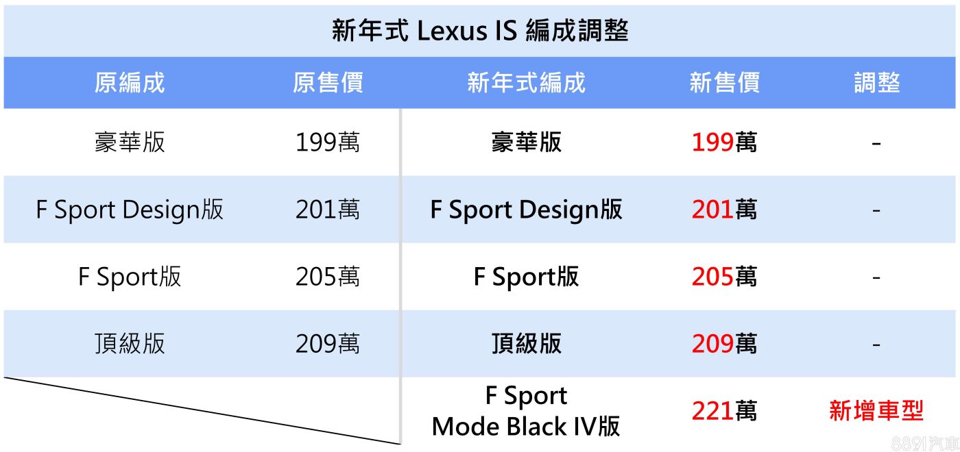 Lexus國內最入門後驅房車「IS」,正式上架新年式陣容,並在原本的四款車型陣容外,追加導入「F Sport Mode Black IV版」特仕車型,開價221萬元、為車系頂規定位!既有車型則維持原價原規格不變。