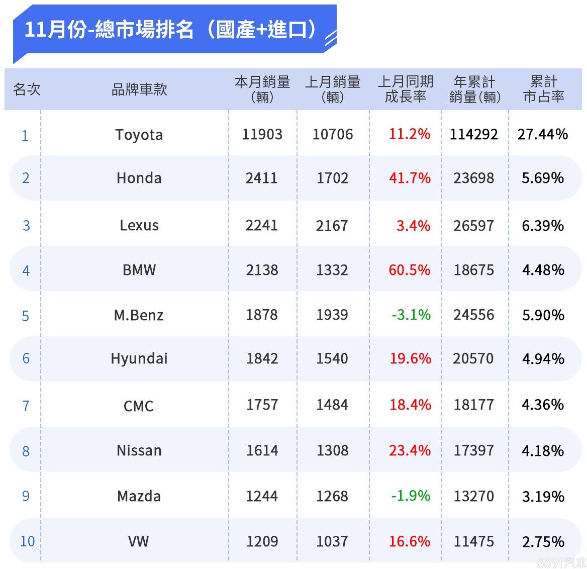 11月Top 10品牌銷量幾乎是一片通紅,其中又以BMW成長超過6成最可觀,而Honda更是靠著4成漲幅,衝上第二名的席次,中華汽車在全新J Space上市後,也帶動品牌成長;而少數下滑的車廠如M.Benz、Mazda,衰退幅度並不多,皆控制在不到5%。