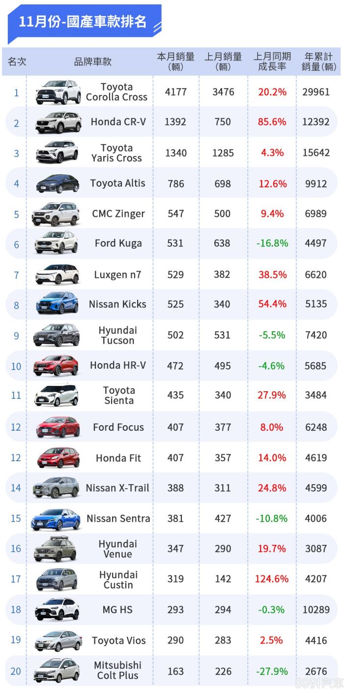 雖然Corolla Cross在9月因為產品更新,短暫將寶座讓給同門師弟Yaris Cross,不過隨著10/1小改款上市,挾帶著更豐富的產品面,以及全車系降價的殺招,在10月就立刻以3476輛回歸「神壇」,而11月表現再進一步,繳出4177輛的亮眼數據,是今年僅次7月的第二好成績,逼近過往月銷5千台的榮光。不過神車最大的對手顯然就是自己,今年截至11月掛牌數為29961輛,雖然仍穩坐國內最暢銷車的頭銜,但相比去年同期已下滑11.4%之多。