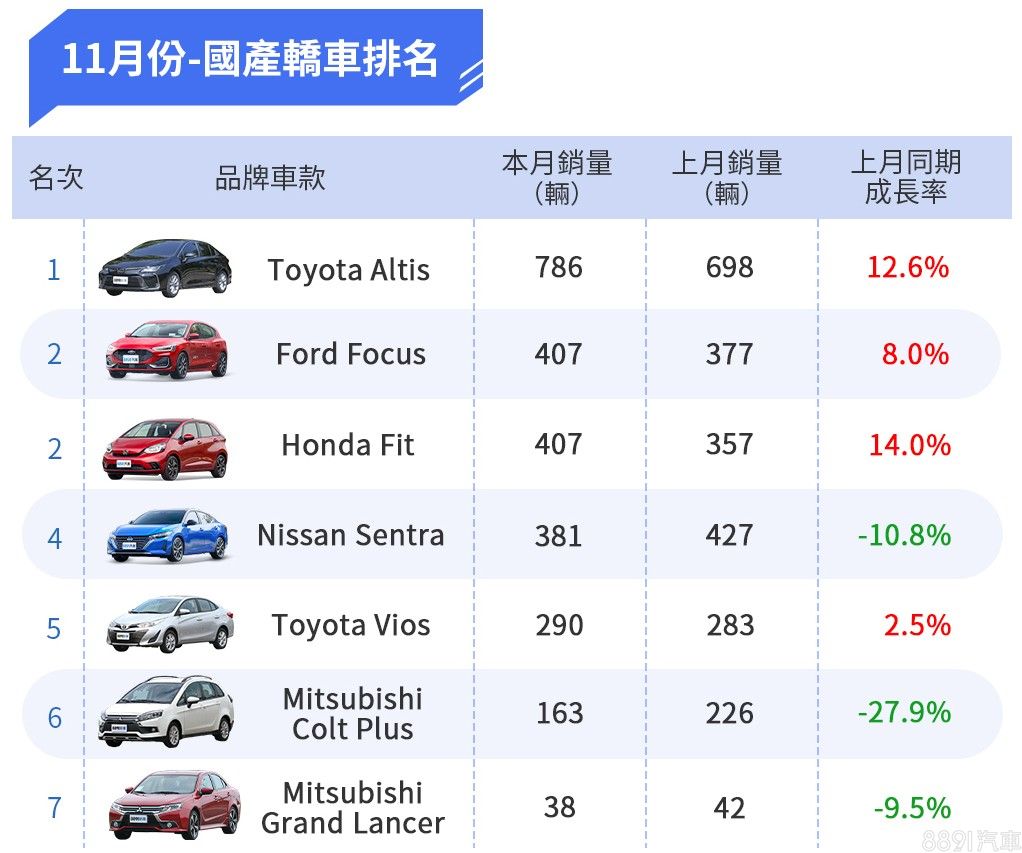 Focus與Fit本月銷量相當,掛牌數都是407輛,各自成長了8%與14%,兩車不約而同的在11月加大促銷力道,都是主打限時加配備不加價的策略;至於Sentra則是掛牌數掉了1成,也讓排名跟著下滑,而Sentra本月續推「黑化雙生版」,限量200台,主打內外個性化套件。