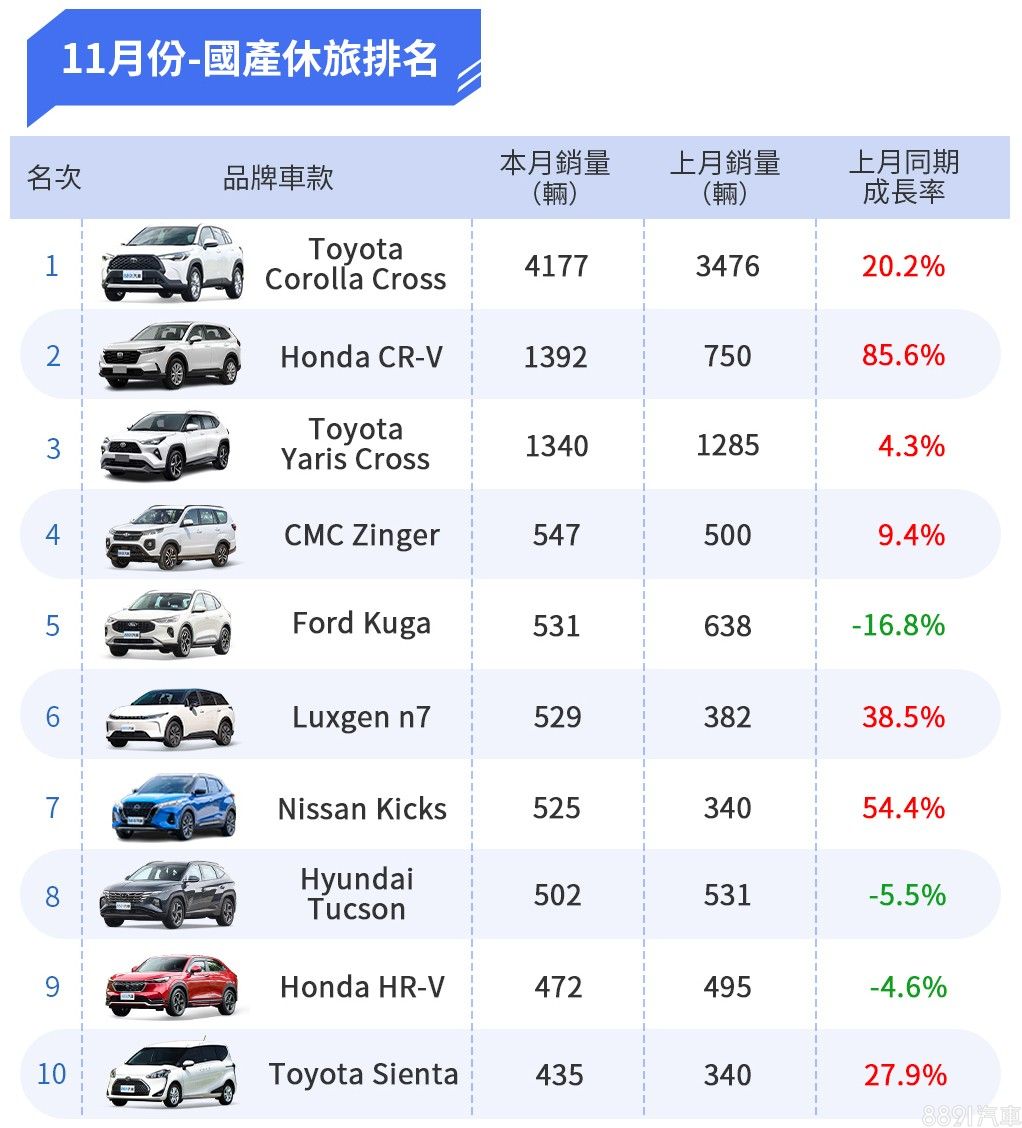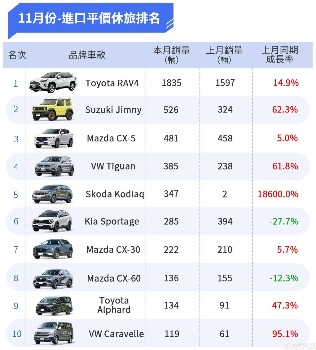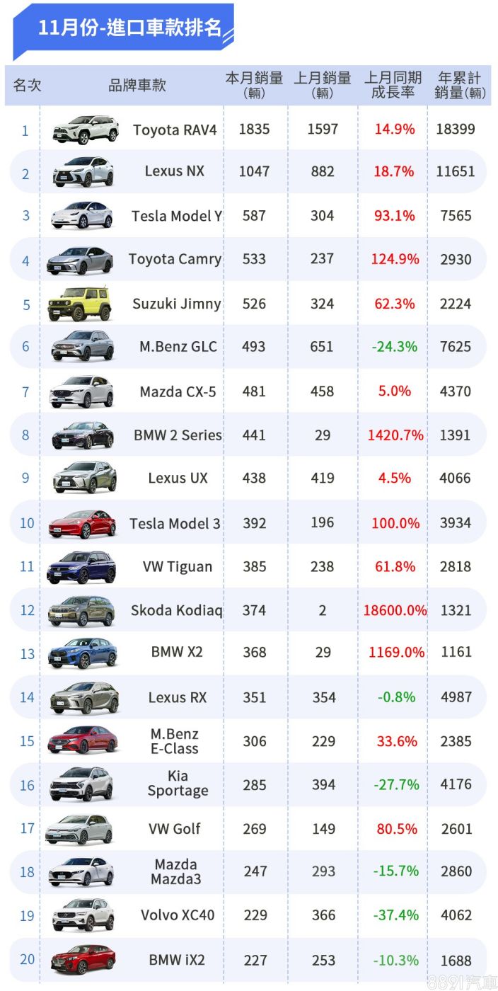 11月進口級距的暢銷榜首仍由Toyota RAV4拿下,同集團Lexus NX也拿下亞軍位置,且相比10月份各自有14.9%、18.7的成長幅度,剛引進不久的大改款Camry表現也不錯,有533輛、124.9%的成長幅度,用優異配備與性價比,為沉寂已久的轎車市場注入活泉。