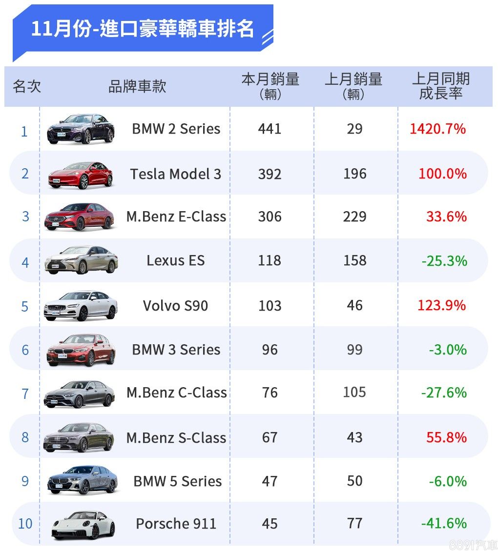 11月進口豪華轎車的黑馬是BMW 2 Series,雖然已過往經驗來說非熱銷車型,但今年中進行過編成修改,加入218i入門車型,將價格帶向下延伸,配備也到位,讓下半年衝出一波訂購潮,只要有新車到港就是台數暴增。