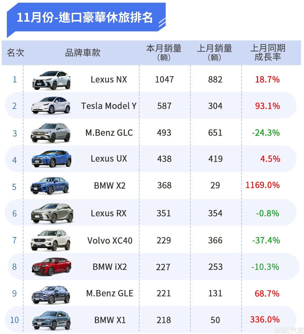 11月進口豪華轎車成長最多者為BMW X2,有大量新車到港交付,另外X1也是相同情況,兩者都在11月銷量明顯成長,分別佔據第5、10位置,iX2也是進口豪華休旅進榜常客。Tesla繼10月後,到11月仍穩定有車交,Model Y成長93.%拿下亞軍。