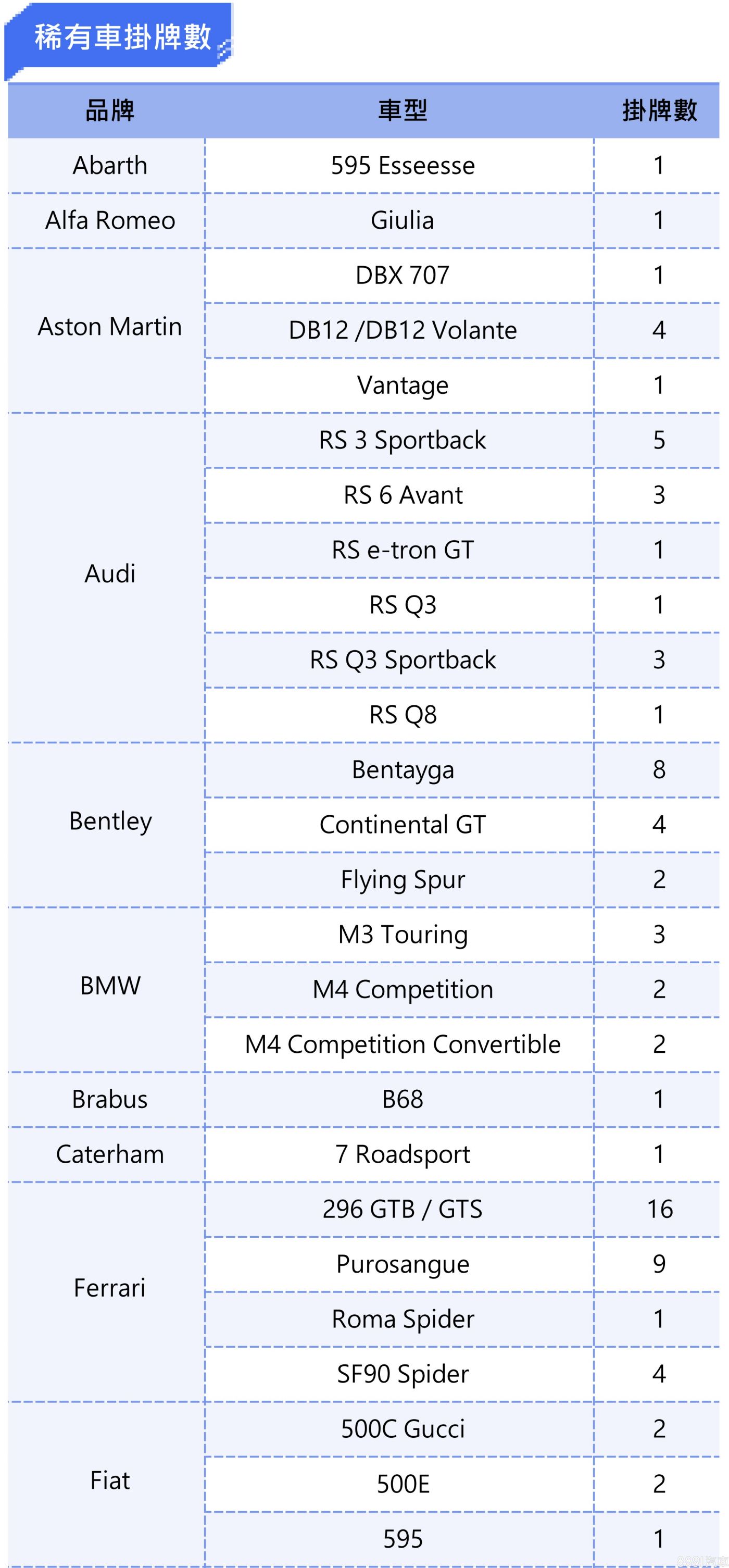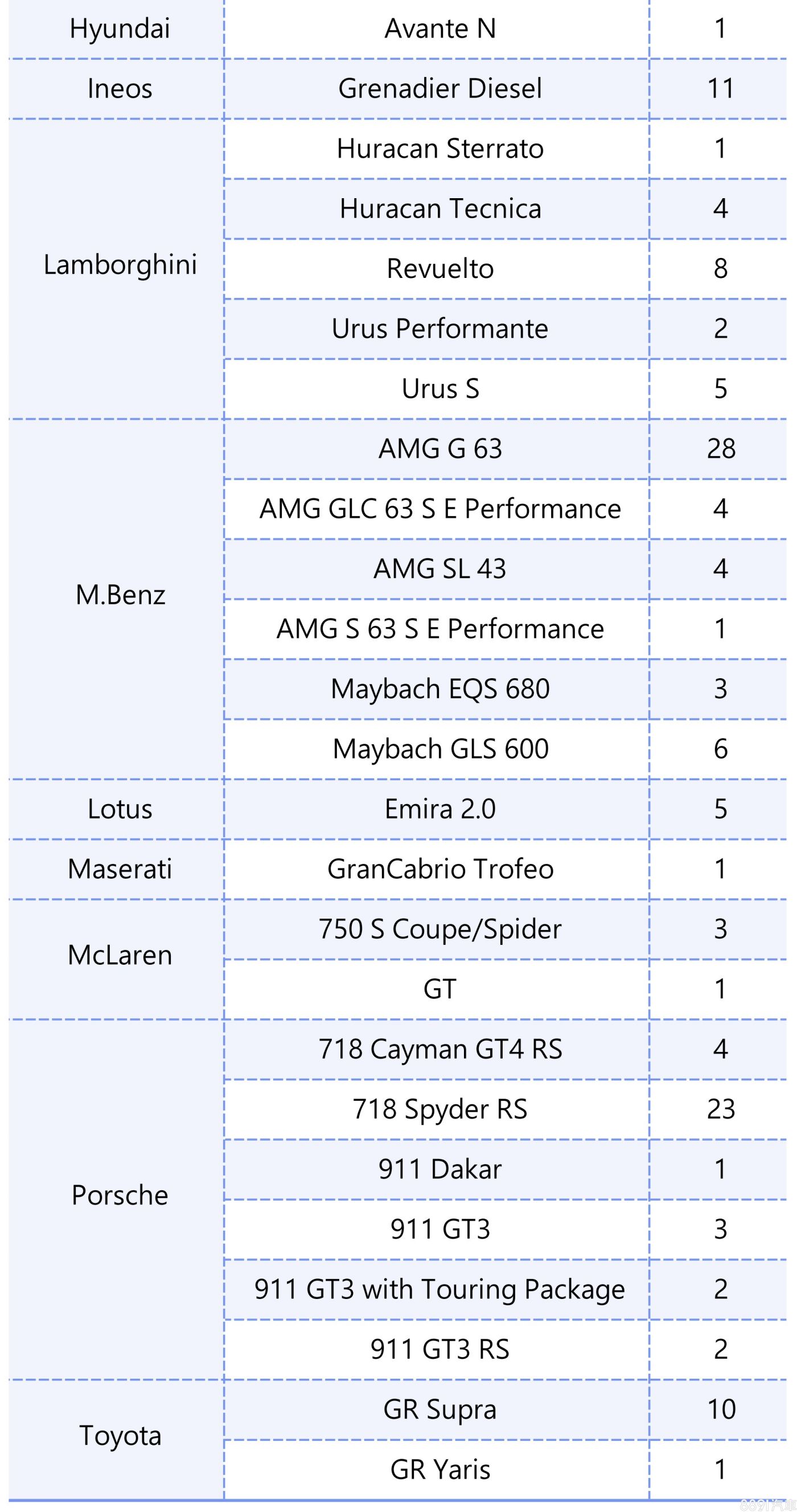 本月稀有車市場不論掛牌數或稀有度都沒啥看頭,超跑品牌領牌車款多屬常販車型,領牌數也沒有前兩個月那般爆量演出,AMG與M Power也是穩定交車,沒有太多讓人眼睛為之一亮的車款。