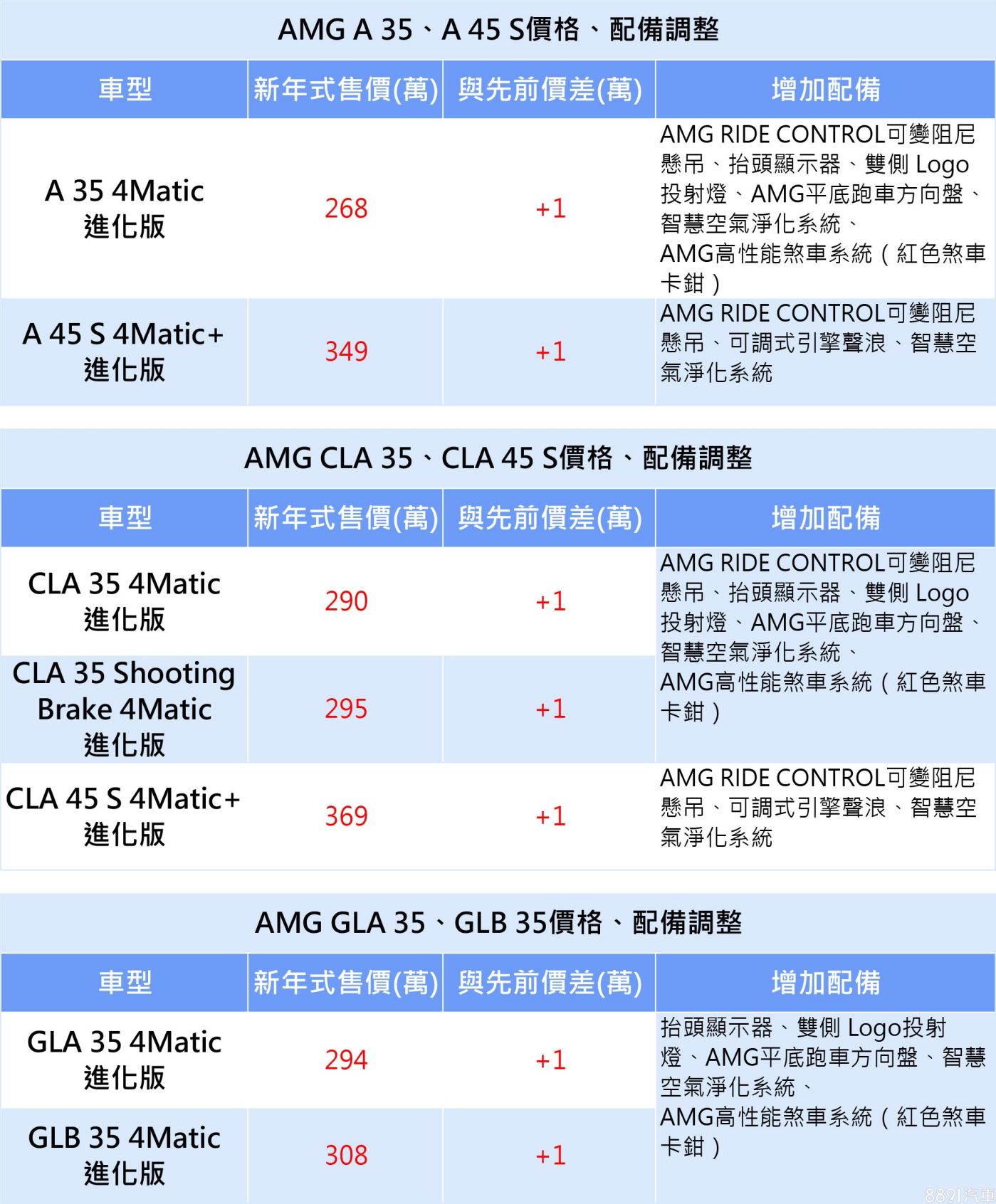 此次推出新年式進化版的包含A-Class、CLA、GLA、GLB車系、旗下AMG性能化車型,售價方面全數上漲1萬元,配備則進行相當有感的升級。