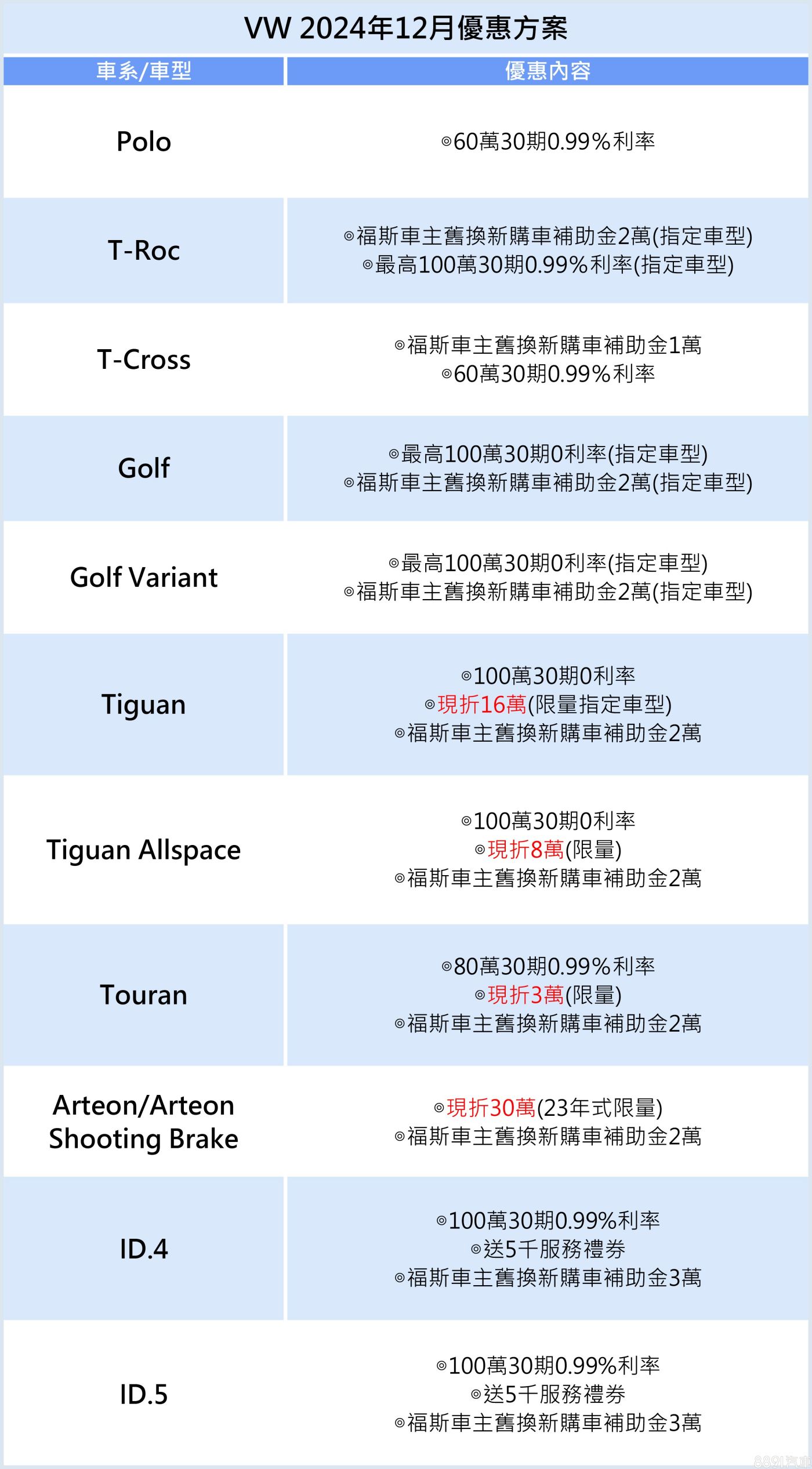 12月台灣福斯主要針對全車系推出優貸方案,熱門車系如Golf、Tiguan,均提供額度最高百萬的分期0利率,若原先就是品牌車主,還能享舊換新購車金,依車型不同,補助金最高3萬。