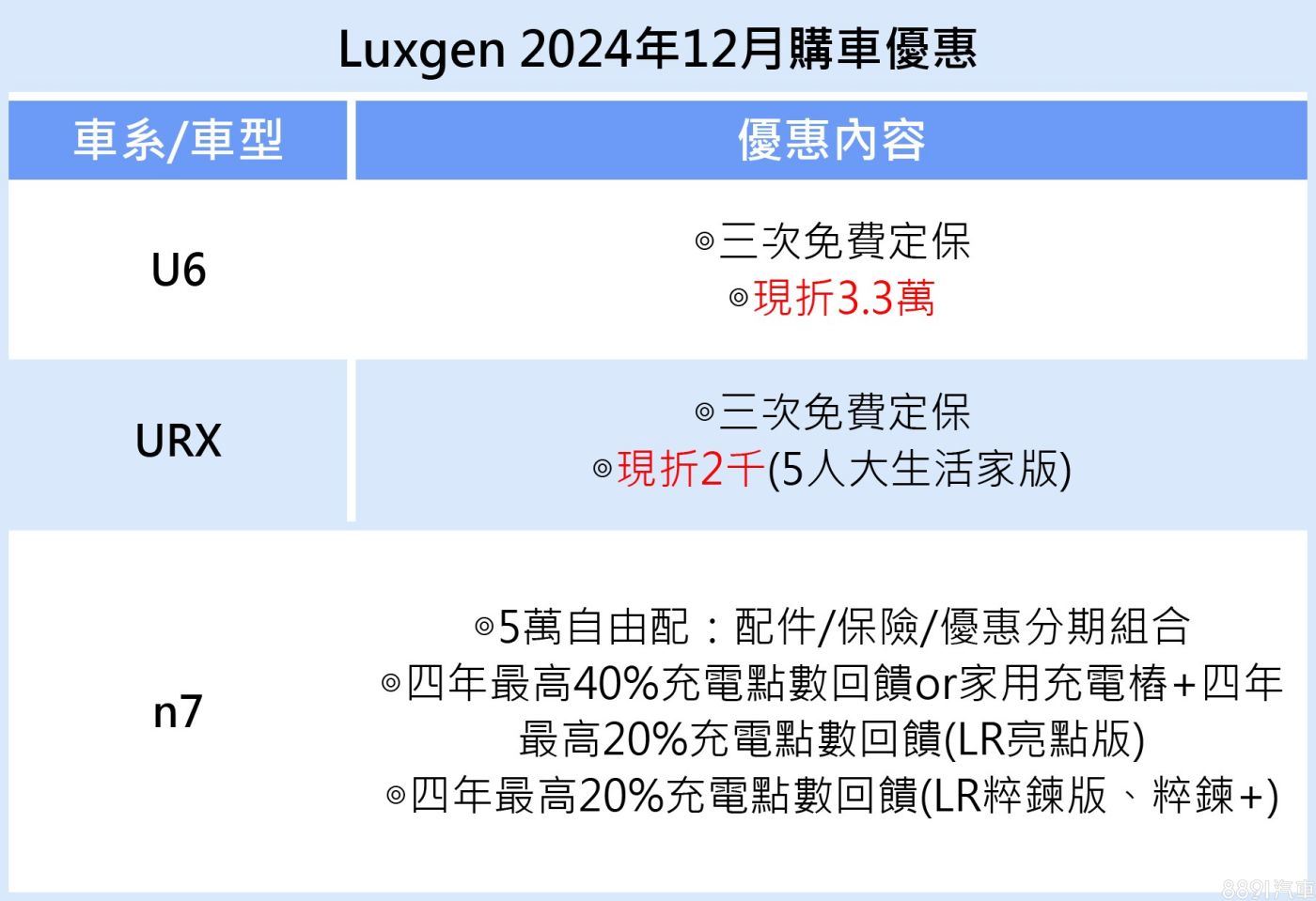 本月入主n7,適用「5萬自由配」,可自行選擇配件、保險或是優惠分期,另指定車型再享最高40%充電點數回饋,或是家用充電樁搭配最高20%充電點數回饋。