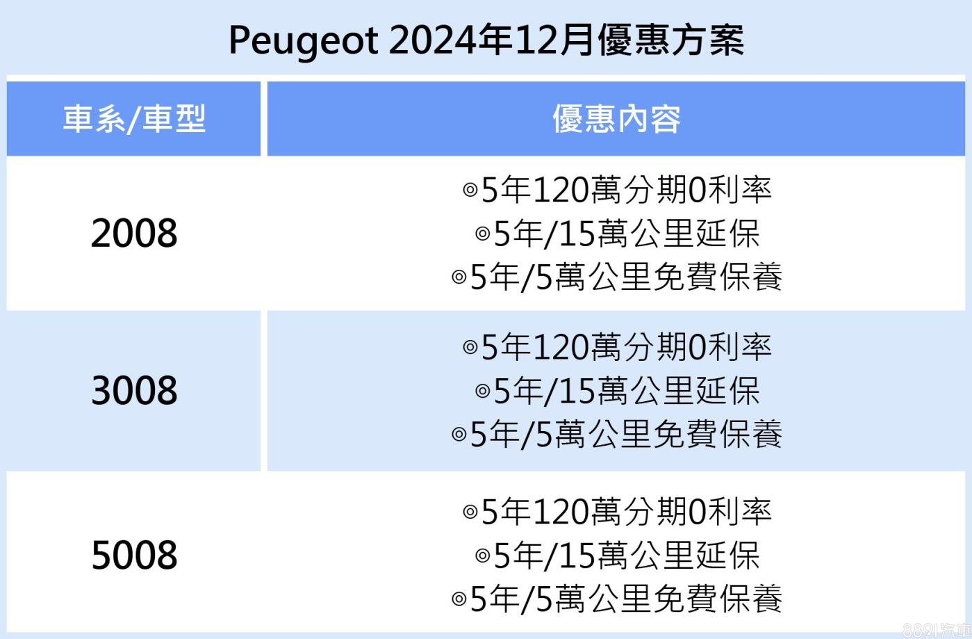 第二重:入主Peugeot 2008、3008、5008指定車型,並於今年12月31日前完成領牌,即享5年/5萬公里免費保養、5年/15萬公里延長保固及5年120萬高額分期0利率。