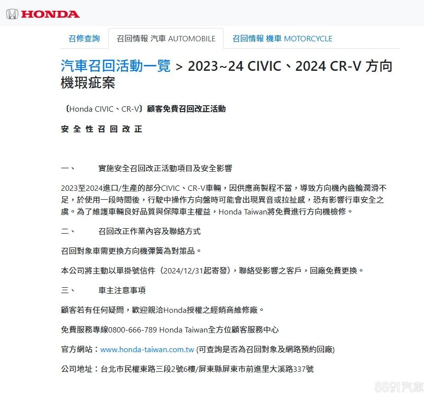 由於方向機供應商製程不當,導致內部齒輪潤滑不足,車輛行駛一段時間後轉動方向盤可能出現異音或拉扯感,嚴重時可能會影響行車安全,對此台灣本田將召回2023至2024年生產、進口之CR-V、Civic進行檢修。
