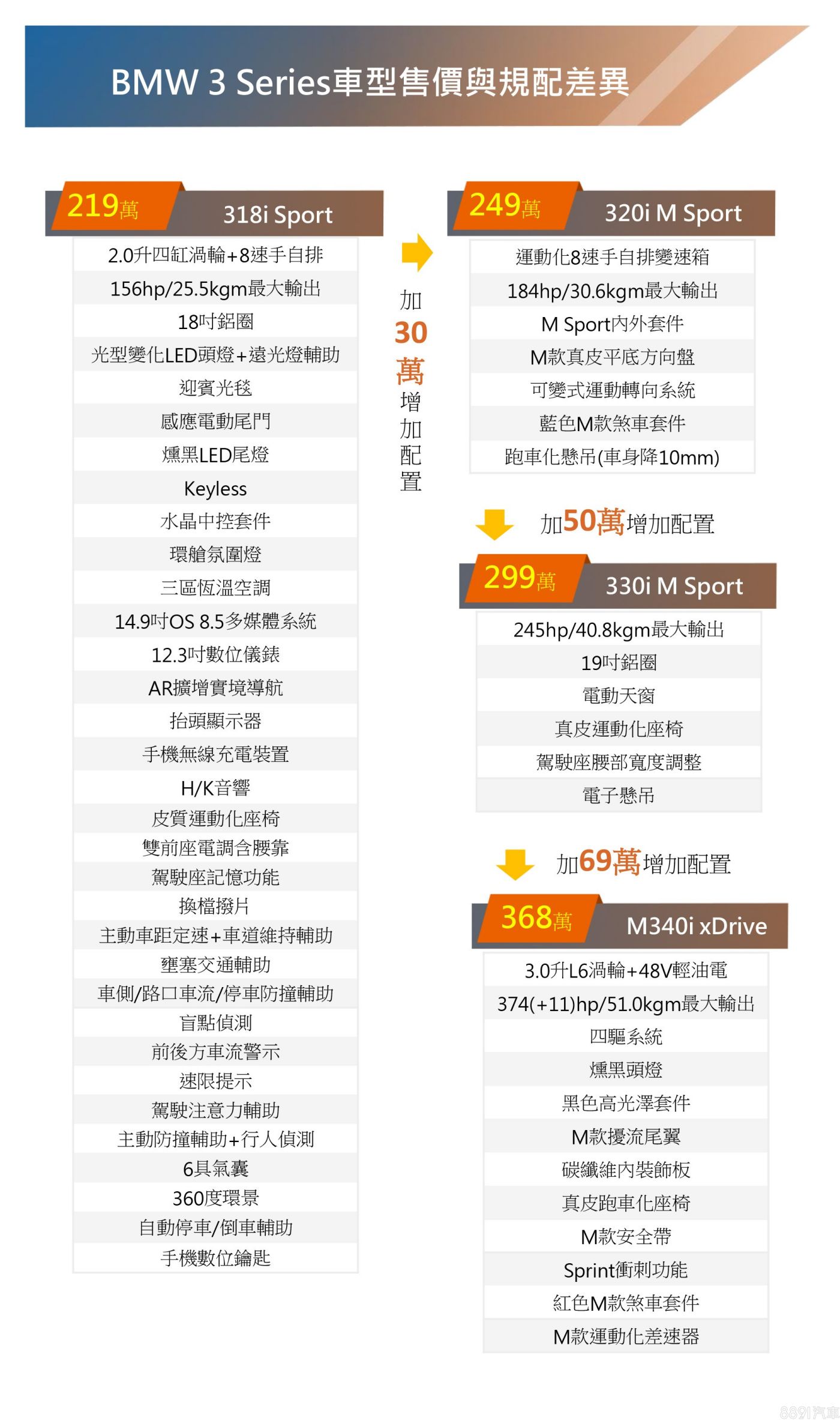 Sedan維持四種車編成,從入門318i起就有豐富配備,全新車載系統、高階H/K音響、主動頭燈等配備,往上除了動力有別,最主要是多出M Sport套件,以及運動化相關升級。