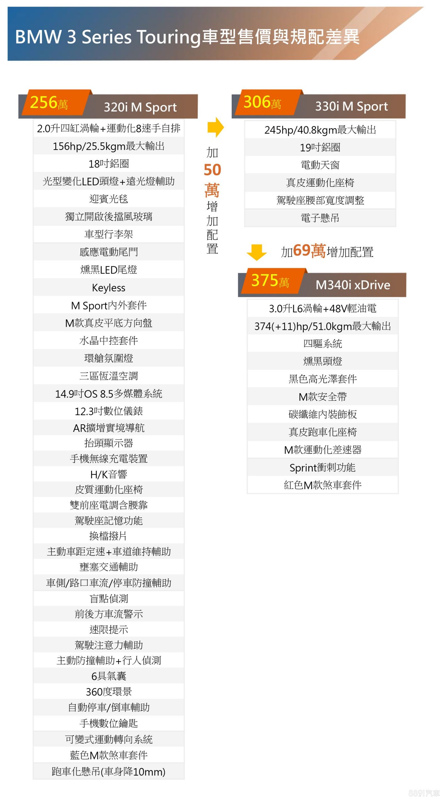 Touring車型也維持跟舊年式相同3種等級,配備分野和Sedan相較,除了沒有318i等級可以選之外,其餘基本上相同,買320i就是大滿配了。