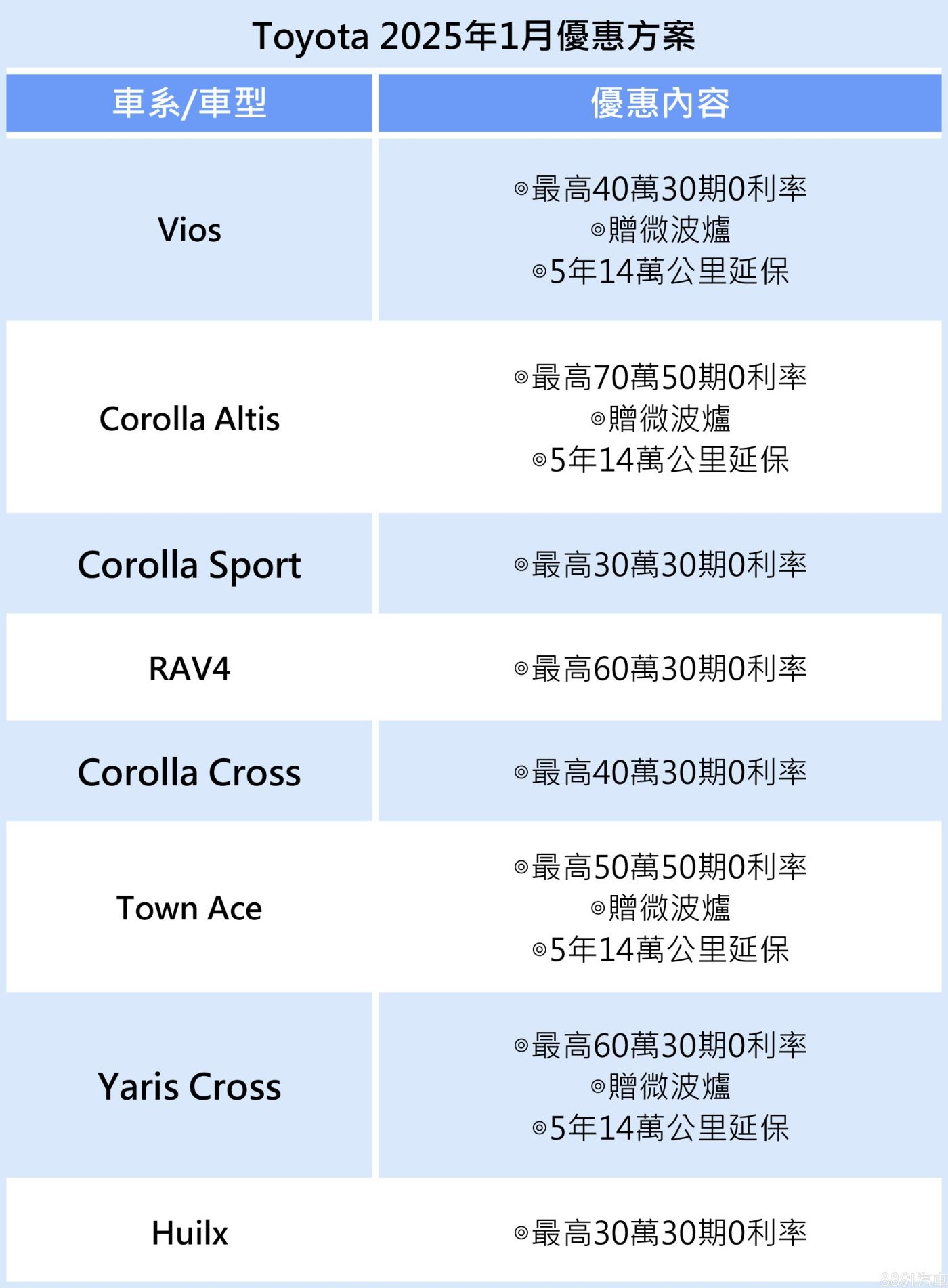 1月入主Vios、Corolla Altis、Town Ace、Yaris Cross等車系指定車型,均獲贈象印烘烤微波爐,並可享高額0利率、5年14萬公里延保等優惠。