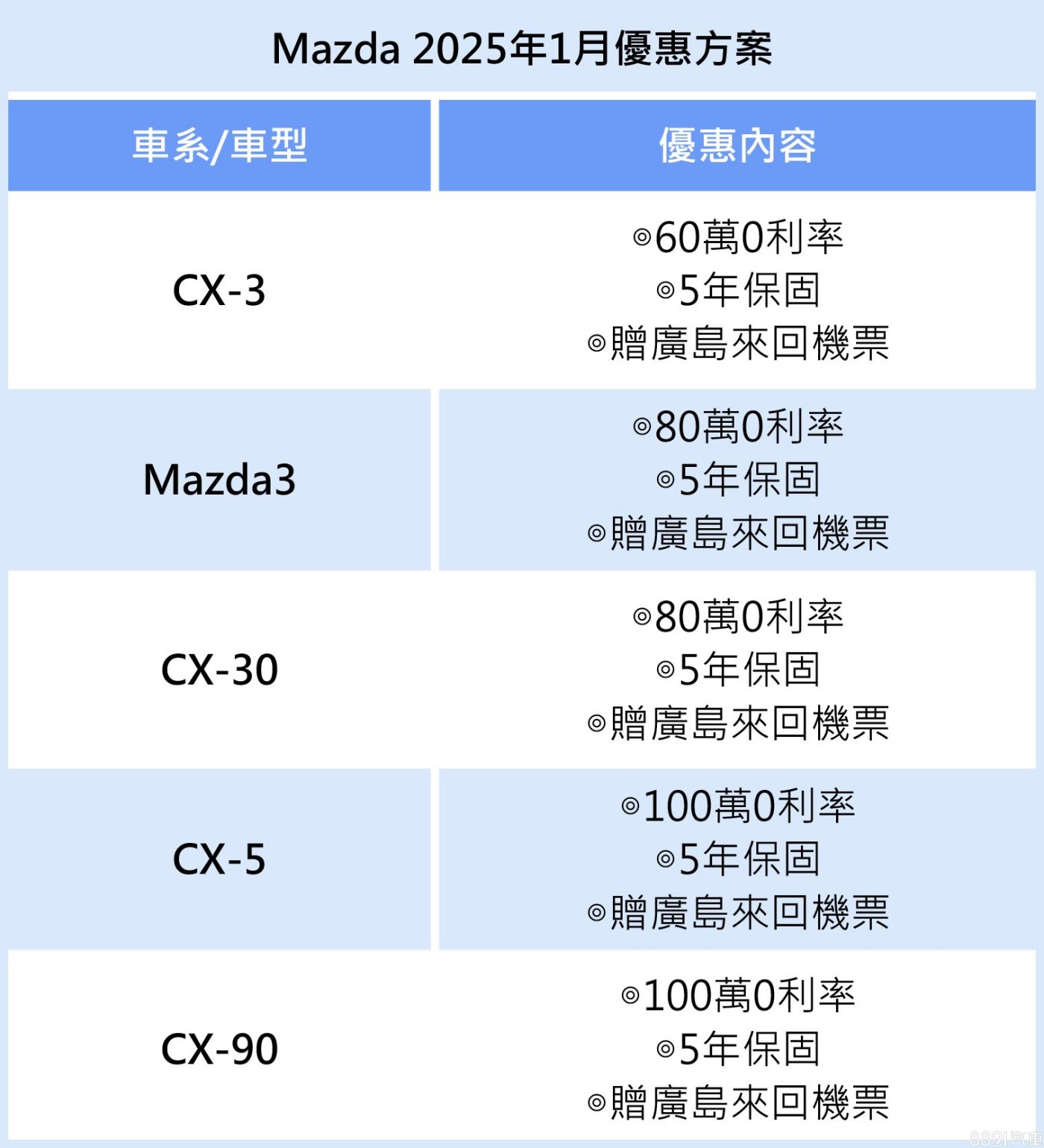 只要於1/24前入主Mazda全車系指定車型,就送日本廣島來回機票,另可享有最高100萬分期0利率,以及5年原廠保固。
