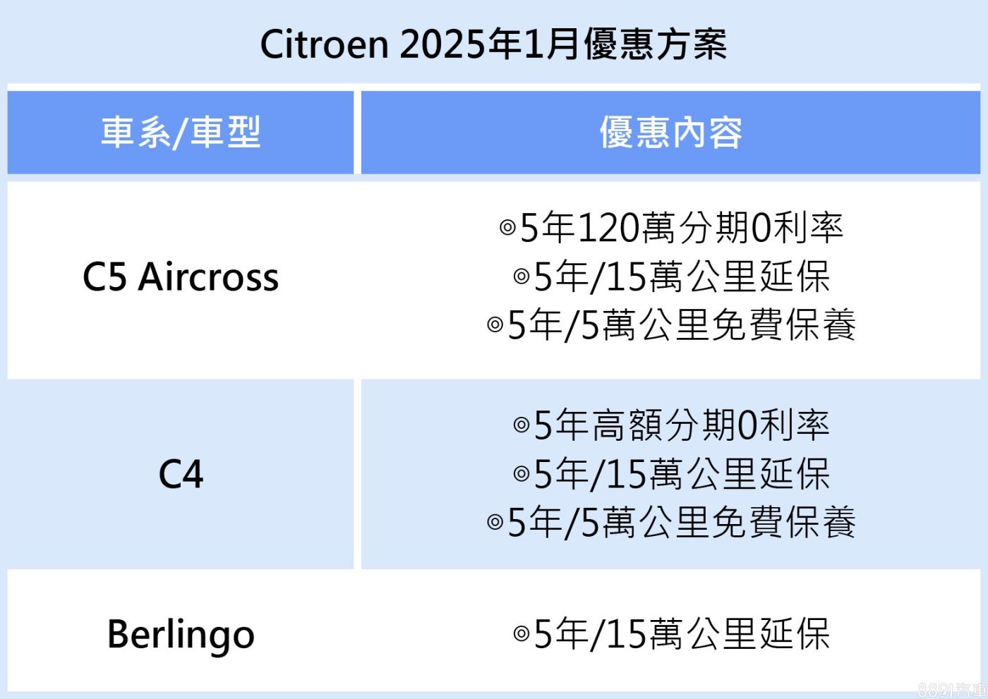 針對C5 Aircross、C4指定車型,除了能享高額0利率,也同步提供延保、免費保養,另新上市的Berlingo則適用5年/15萬公里延保方案。